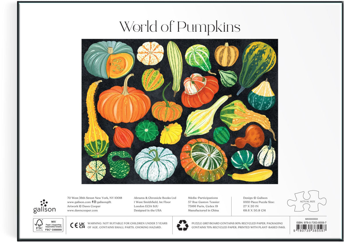 The World of Pumpkins Puzzle by Galison features a charming collection of different kinds of pumpkins and gourds eaten all over the world. Whether you're looking for a fun activity for a rainy day or a unique gift for a loved one, this puzzle is sure to impress! With its intricate details and challenging design, this puzzle is perfect for anyone who loves fall or pumpkin season. Includes an insert with the full puzzle image for reference.
