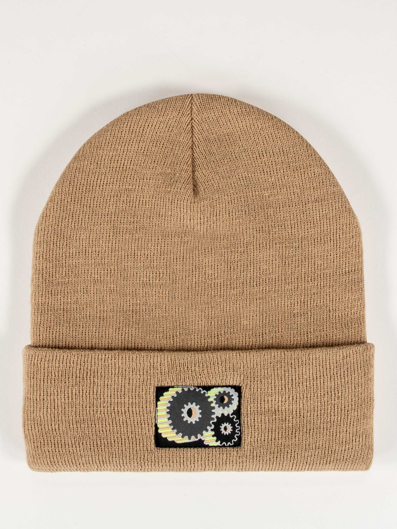 Just over here, trying to accommodate the geniuses of the world... This stretchy, light brown hat is knit from 100% recycled polyester and features a soft, sewn-on patch. It comes packaged with a removable card that reads: "Brain Warmer // For BIG Thinkers // <-- Expands As Needed-->"