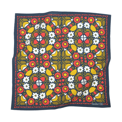 Color: Dark blue background with mustard yellow, hot red, and olive green flowers