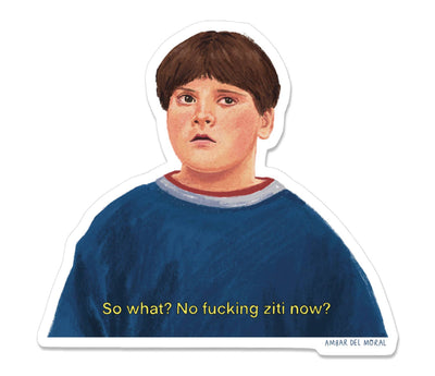Young A.J. from The Sopranos TV show with the quote "So what? No fucking ziti now?" in small yellow text.