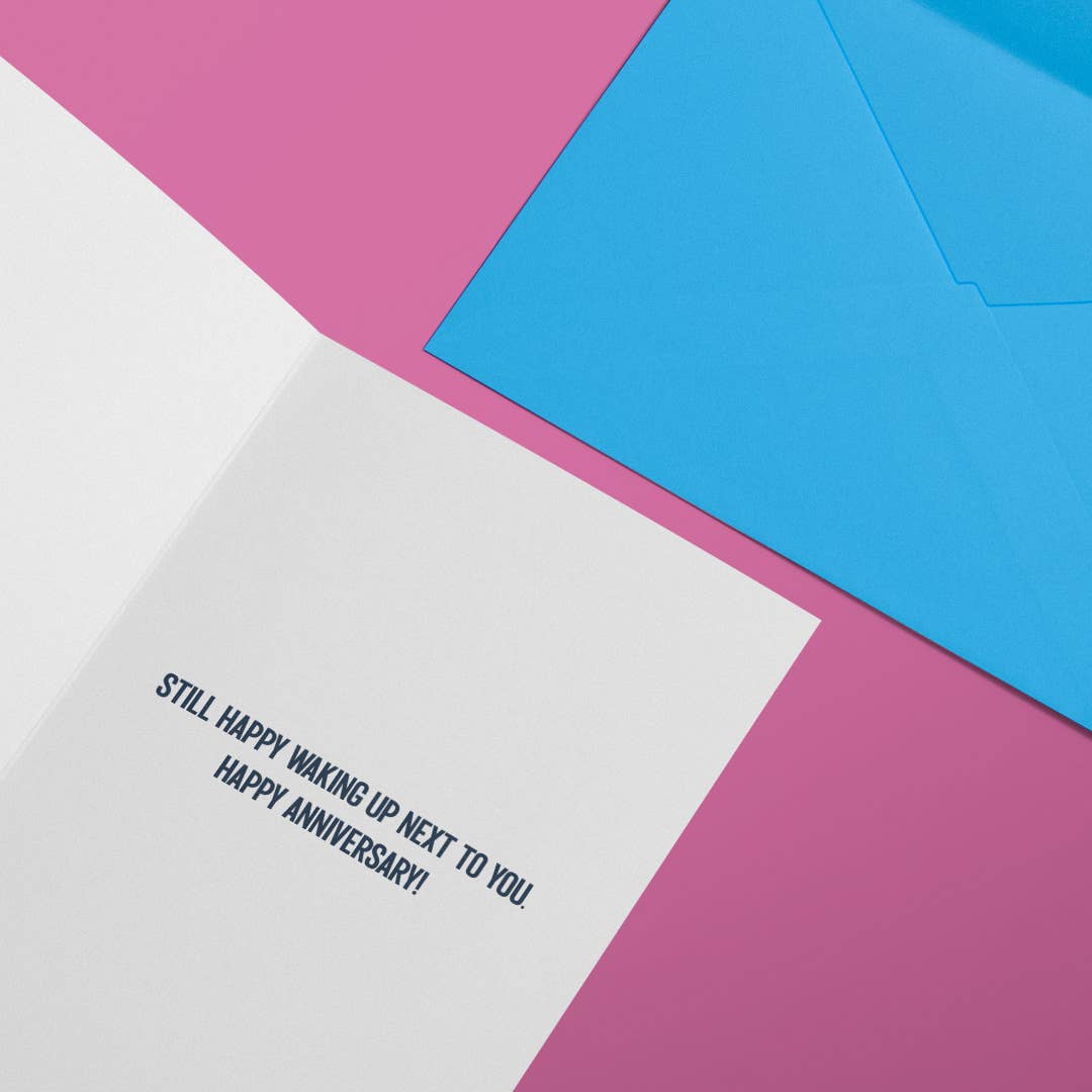 Inside: "Still happy waking up next to you. Happy Anniversary!"