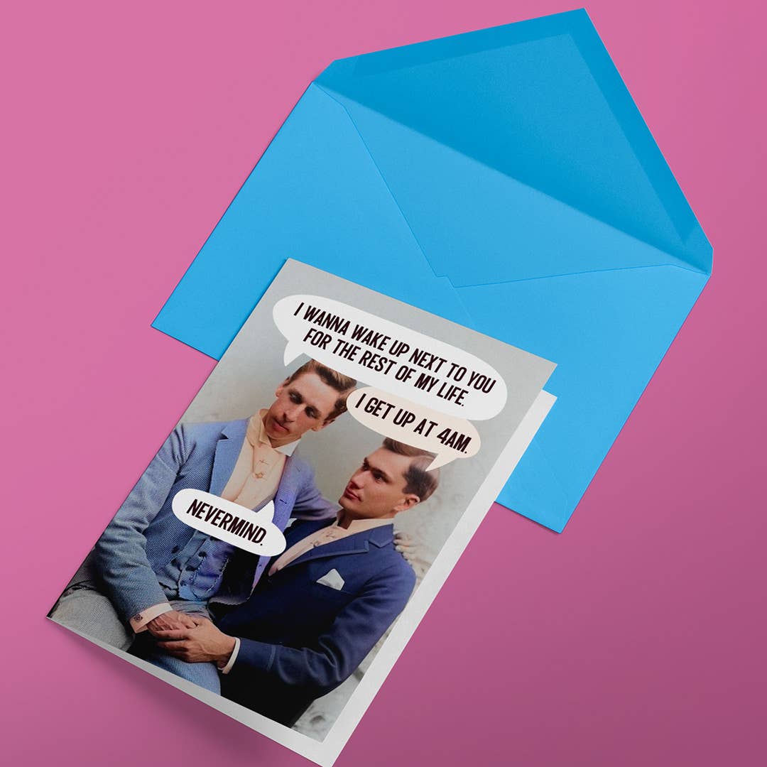 Celebrate love with a side of humor and a touch of vintage charm! Our "Wake Up Next to You" card features a vintage colored Victorian photograph of two men in a romantic pose. One man says, “I wanna wake up next to you for the rest of my life,” and the other replies, “I get up at 4am.” The cheeky response? “Nevermind.” A playful take on love and the reality of those early mornings – because love means making it work, even with 4am wake-ups.