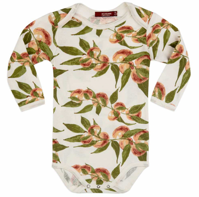 Elevate your little one’s wardrobe with Milkbarn's soft, all-season Organic Cotton Long Sleeve One Piece in the Peaches print. The envelope neckline and ring-snap closures allow for effortless, one-handed undressing of your baby. The contrasting edging highlights the structure and fabric design.
