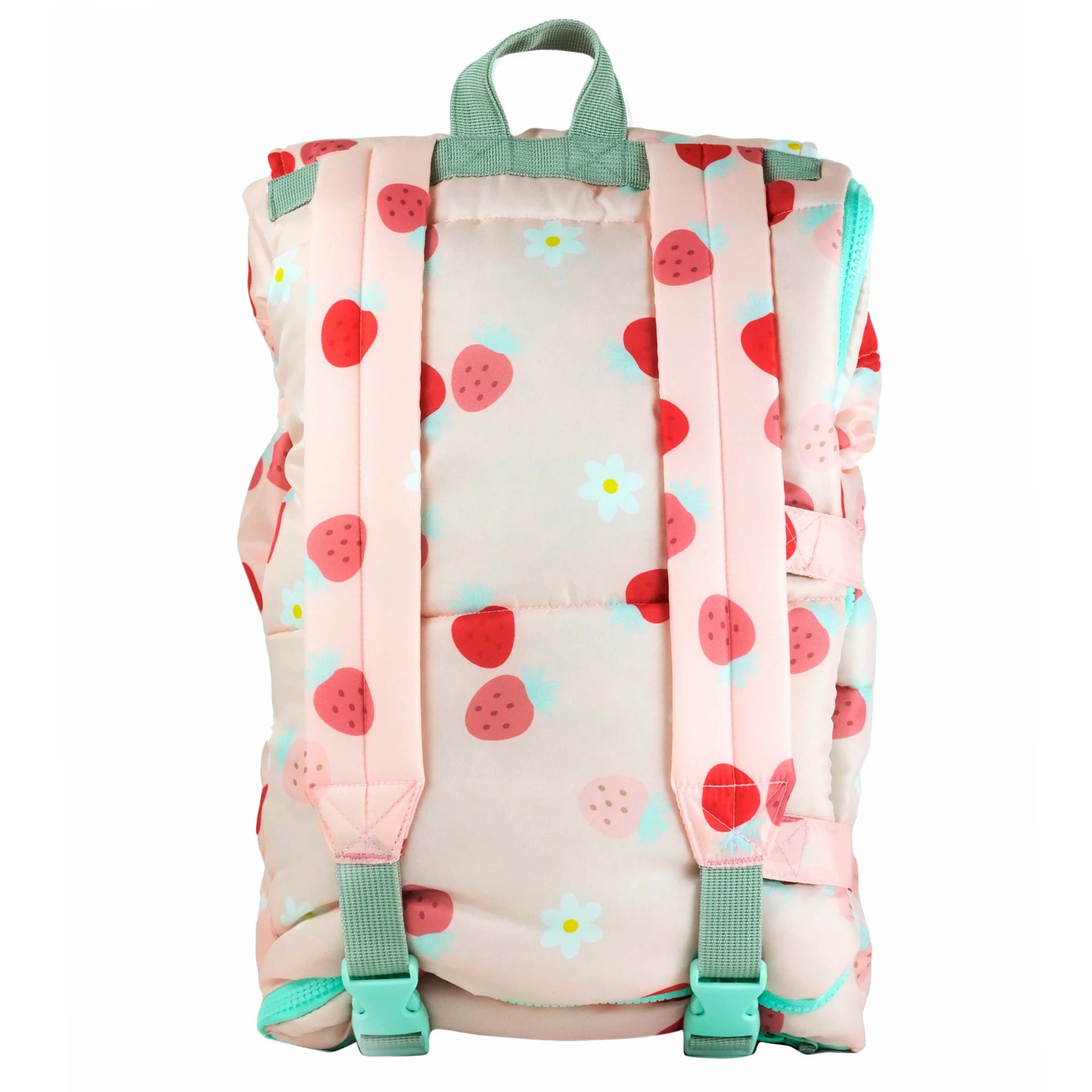 Sleep-N-Pack is a versatile sleeping bag that transforms into a backpack designed for kids to love and for the convenience of parents. Our patented sleeping bag/backpack hybrid is packable, lightweight and folds for easy on-the-go transportation. Strawberries & Daisy print shell with a cozy, seafoam color fleece liner is soft & plush to the touch to keep your kids warm & comfortable. Pale pink buckles and zippers match the cozy plush fleece liner.