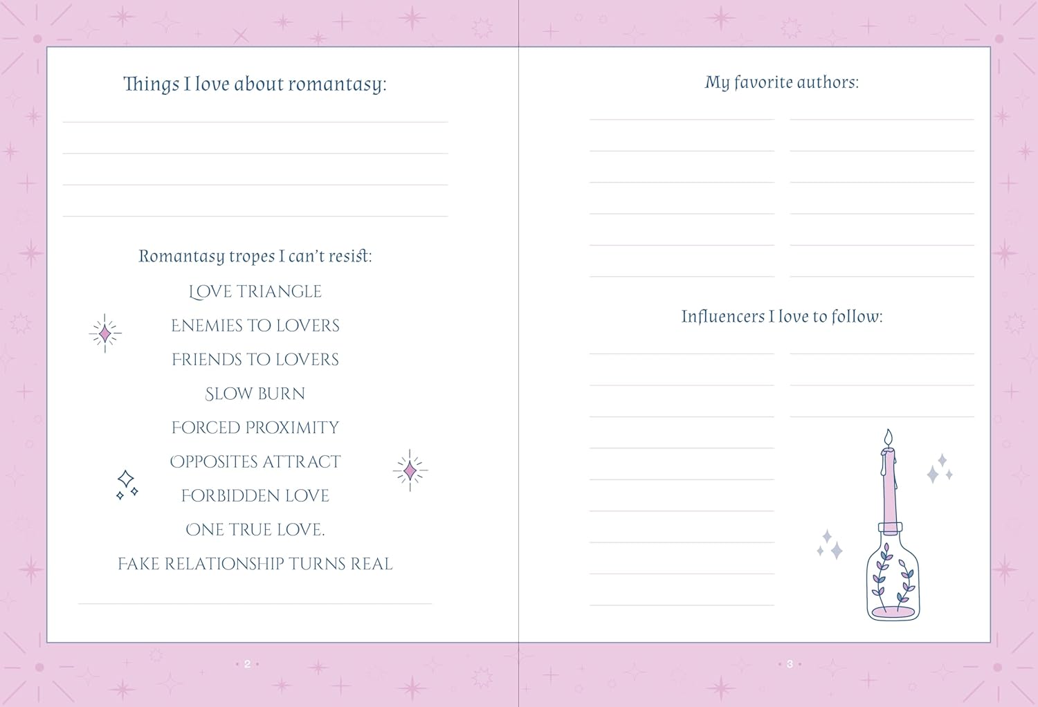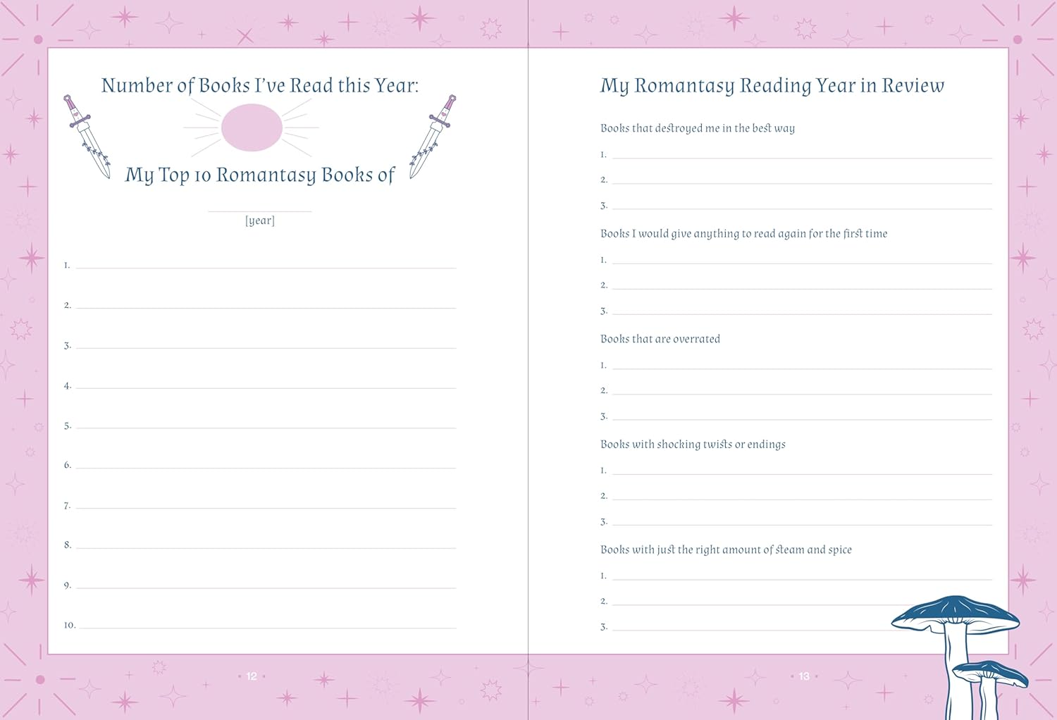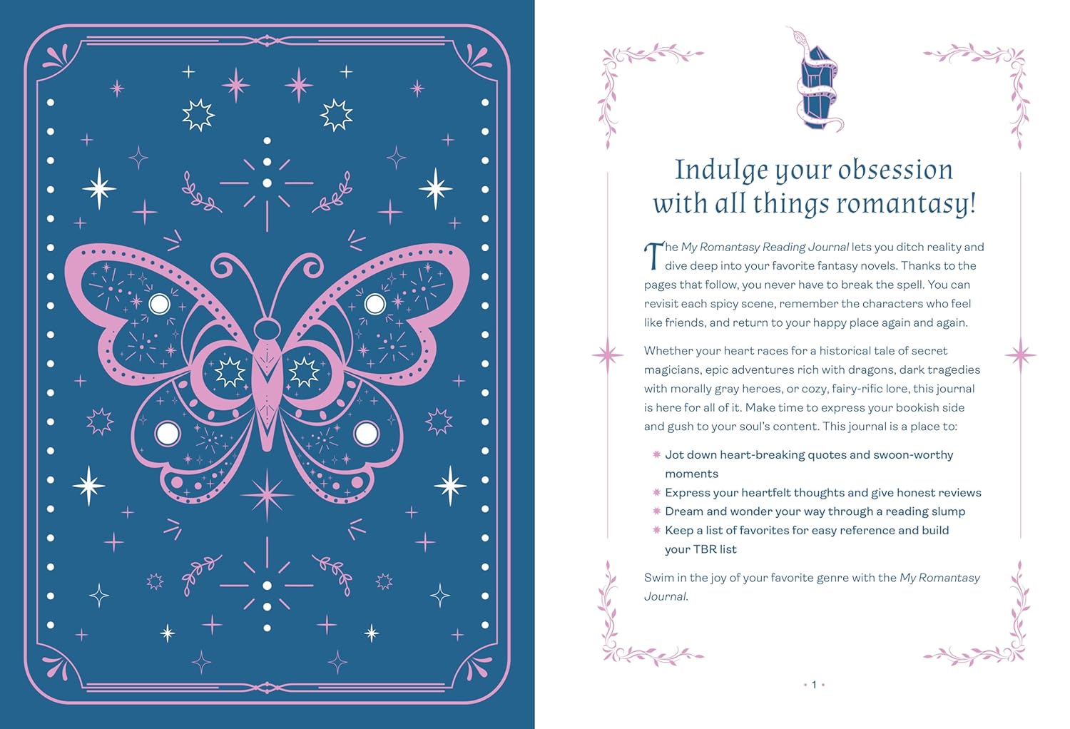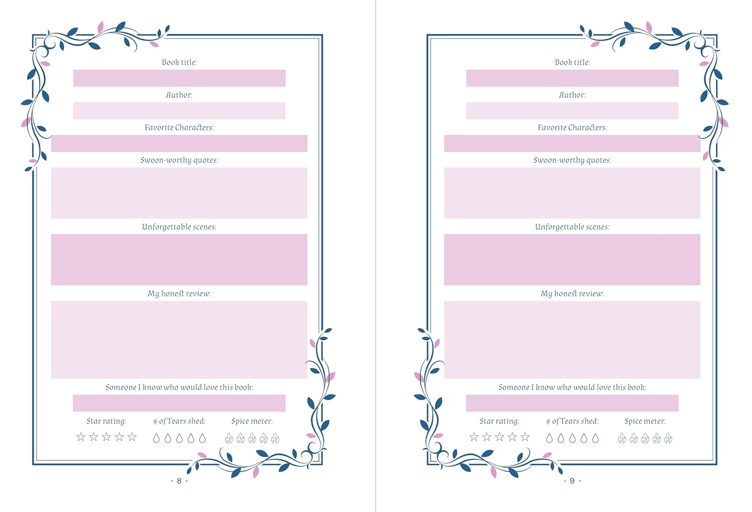 - Artful pages to store your thoughts and feelings about each book (including your star rating, tears shed, and spice meter)
