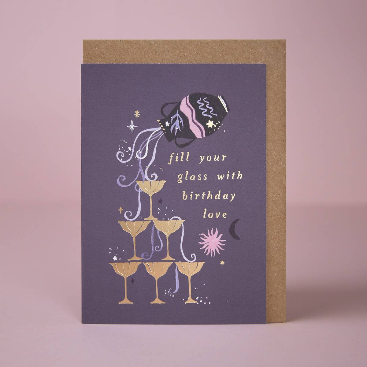 A bubbly beverage flows from a patterned pitcher over a sparkling tower of crystal glasses on this beautiful birthday card.