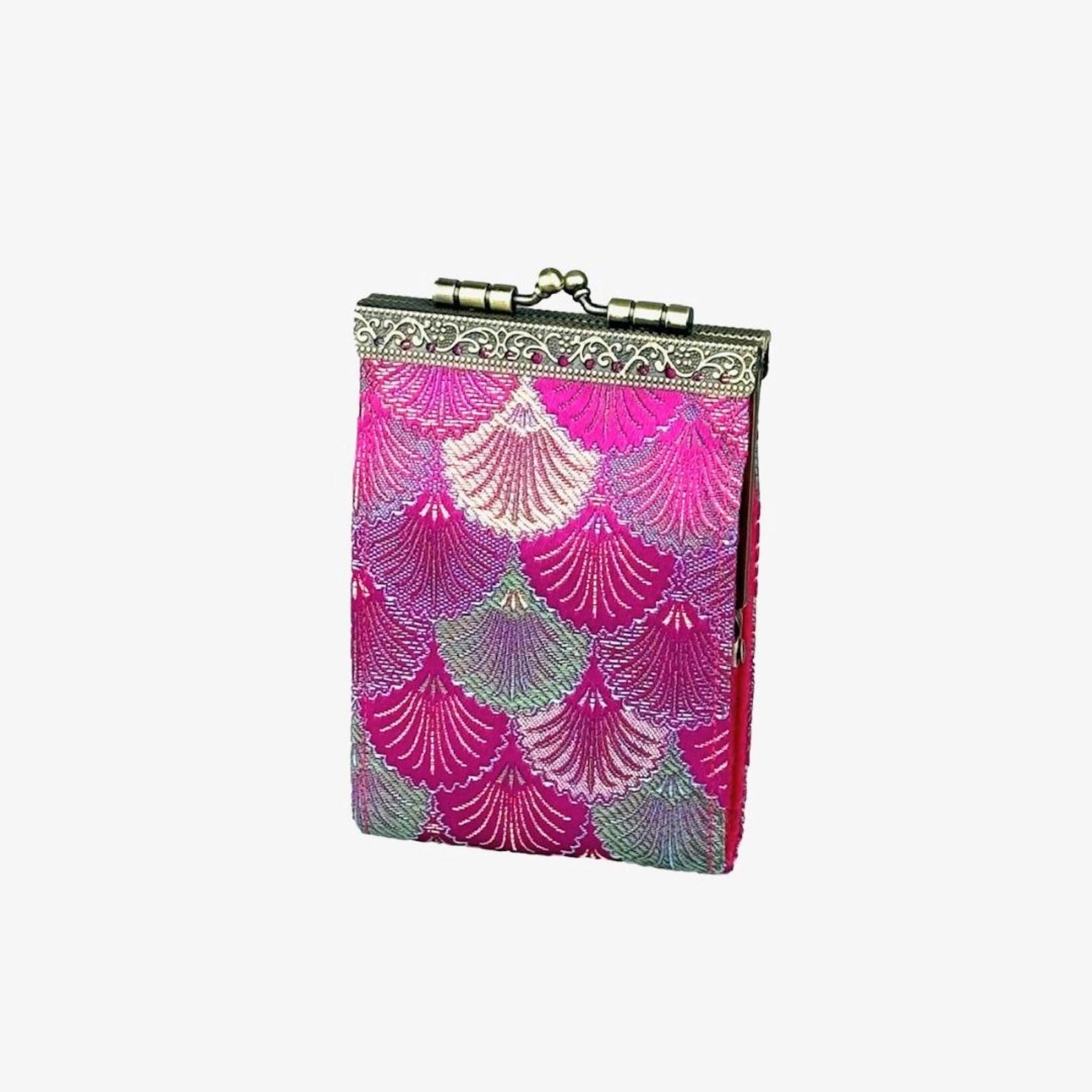 Accordion-style credit card holders with RFID protection, featuring a scalloped design in bold colors. Easy to open and close with a kiss clasp, the pleated slots inside can hold 8 to 10 cards.