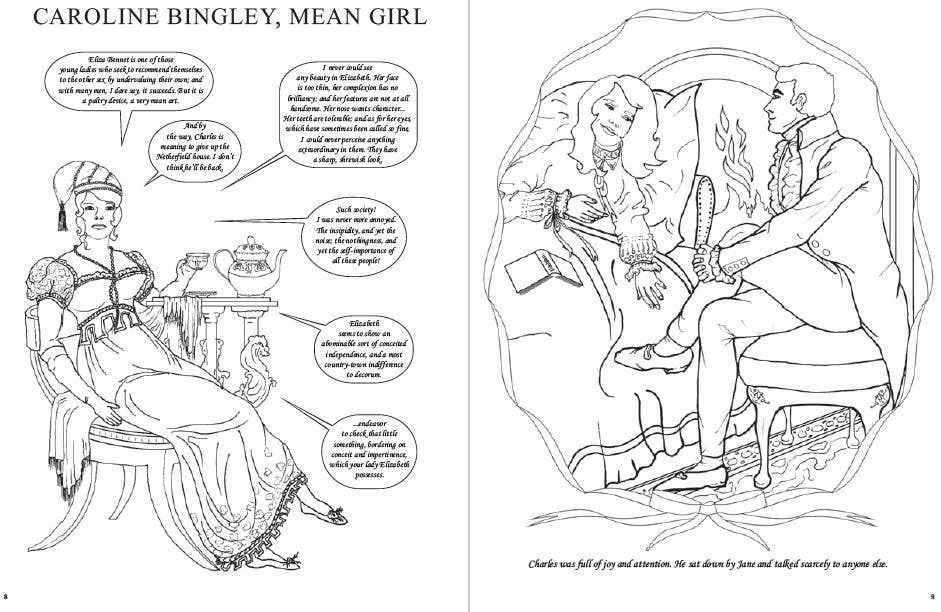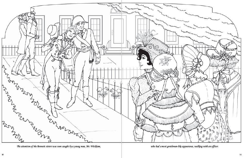 This charming coloring book features 30 original, hand-drawn illustrations from Jane Austen's classic novel, Pride and Prejudice. With a balance of easy, medium and challenging coloring pages, this one-of-a-kind coloring book also features authentic Regency clothing and setting, quotations from the novel, and a bonus Literary Map! Follow the tempestuous romance between Elizabeth Bennet and Mr. Darcy in pivotal scenes from Jane Austen's wry social satire, and color-in Jane and Lydia Bennett, Charles and Caroline Bingley and the nefarious, yet so attractive, Mr. Wickham, among the other characters. Color the Regency dresses and shawls, the English countryside, the great country houses, and a plethora of fabulous hats!