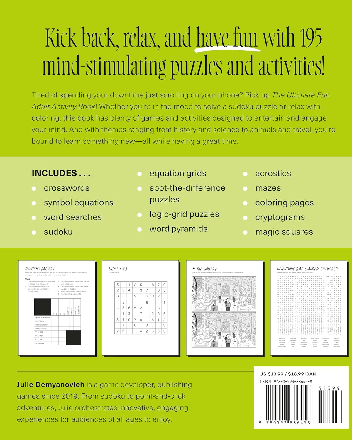 Tired of spending your downtime just scrolling on your phone? Pick up The Ultimate Fun Adult Activity Book and delight in puzzles and activities designed to entertain and engage your mind. Whether you’re in the mood to solve sudoku, crack crosswords, or relax with a coloring page, this book has what you’re looking for. And with the sheer variety of activities and games included, all crafted by an experienced puzzler, you might even discover a new puzzle obsession!