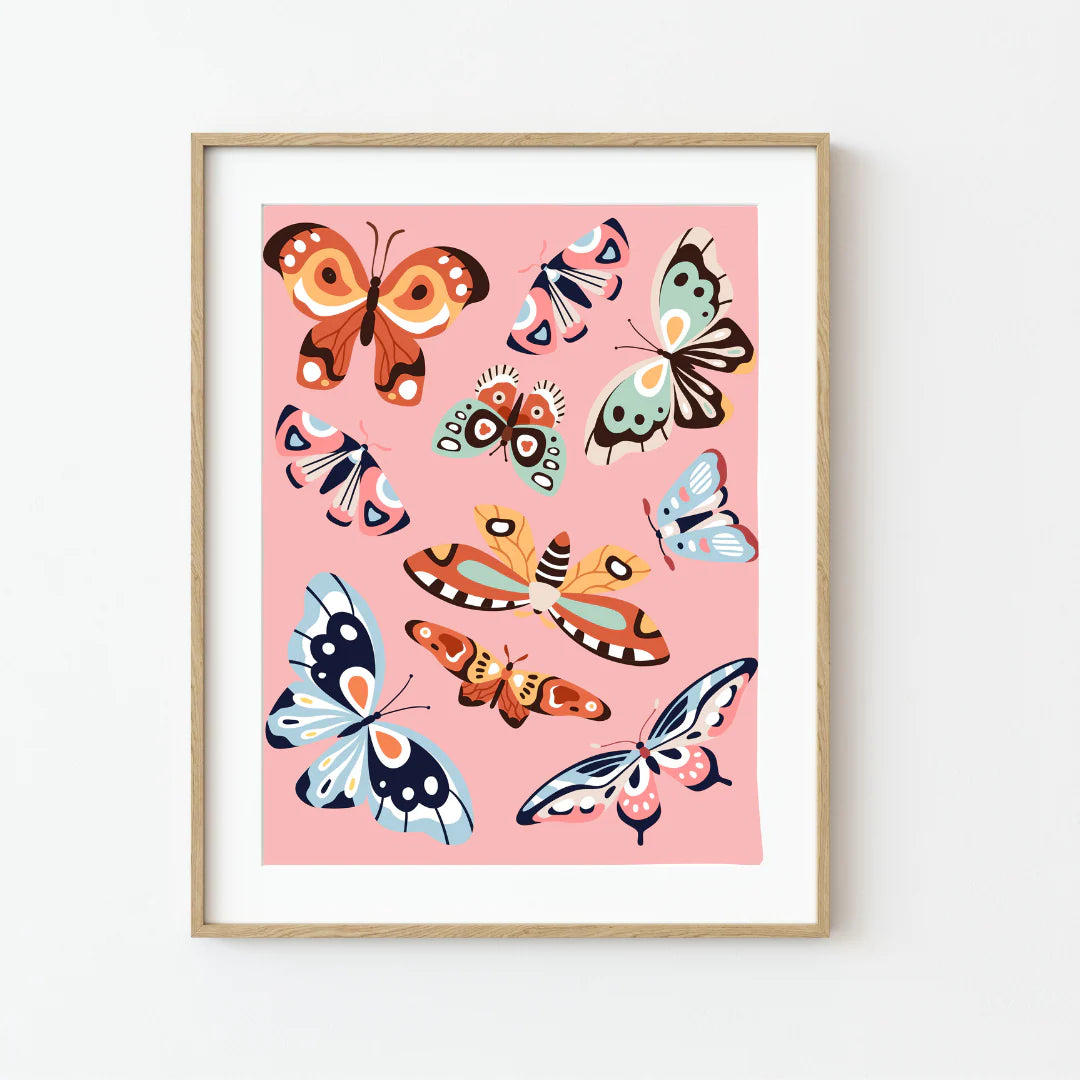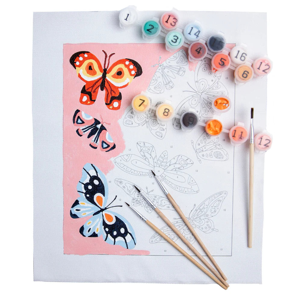 Better You Fly is a bold and beautiful 8x10 paint by numbers kit from our Mid Century Modern collection. Painting a mix of whimsical butterflies and moths set against a soft pink background will surely be one of the most fun activities for a quiet night at home.