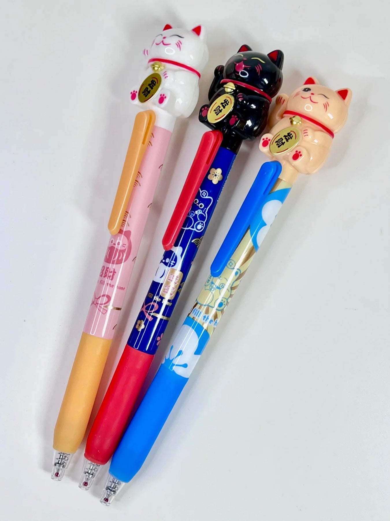 Retractable gel pens from Japan with waving, good-luck Maneki cats at the top! The maneki-neko, or maneki cat, is a common Japanese figurine which is often believed to bring good luck to the owner. These fine-tip pens use gel-based ink, combining the permanence of oil-based ballpoint ink and the smooth glide of water-based ink.