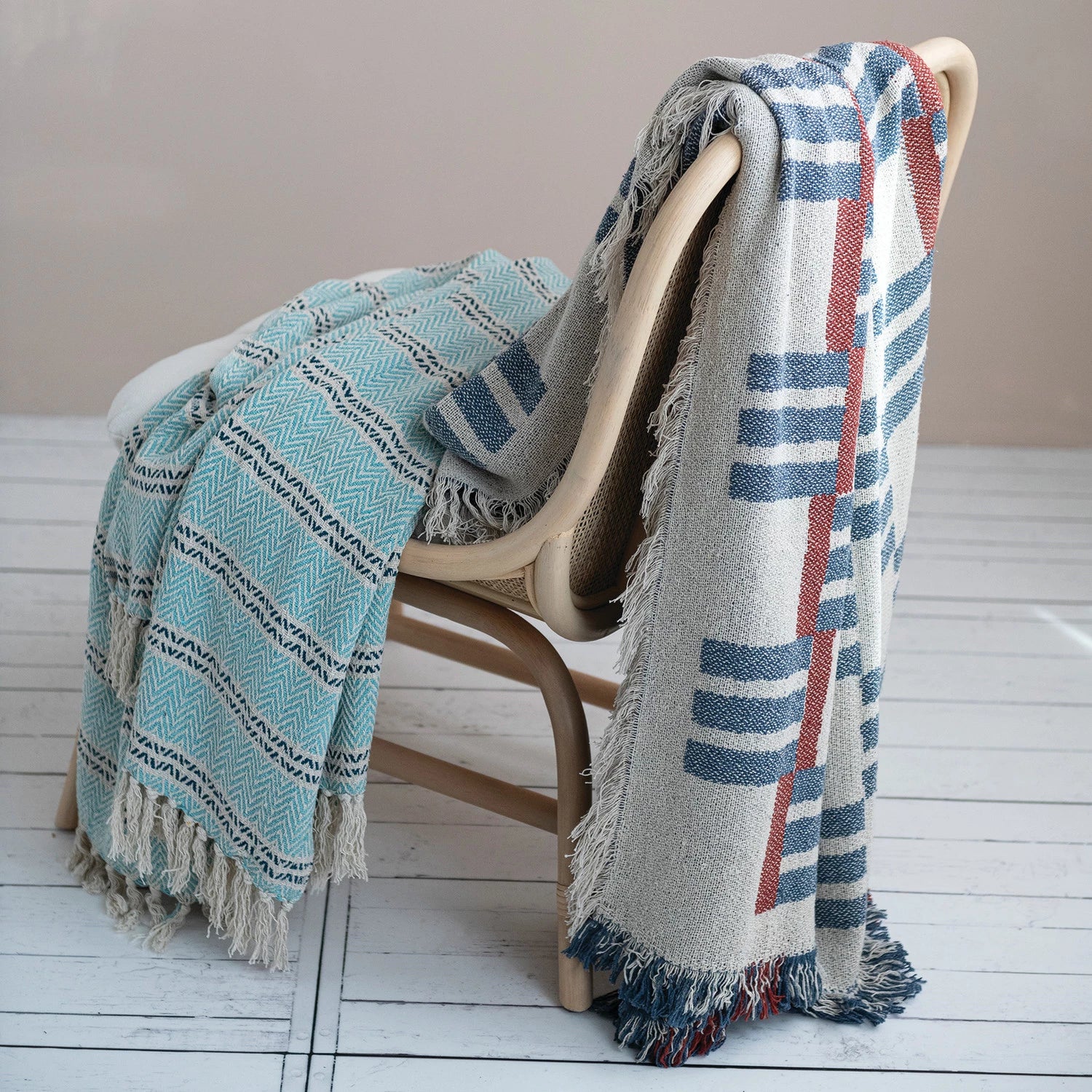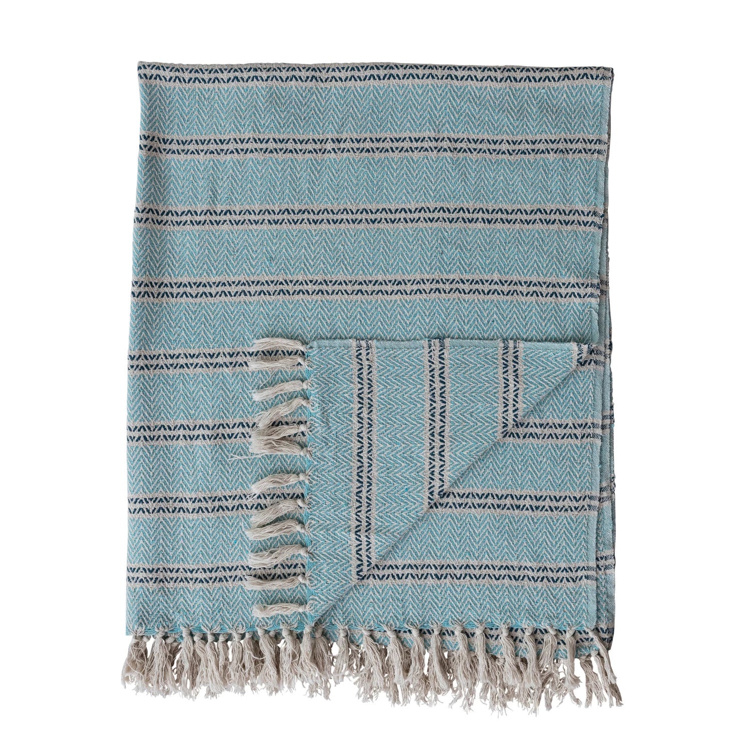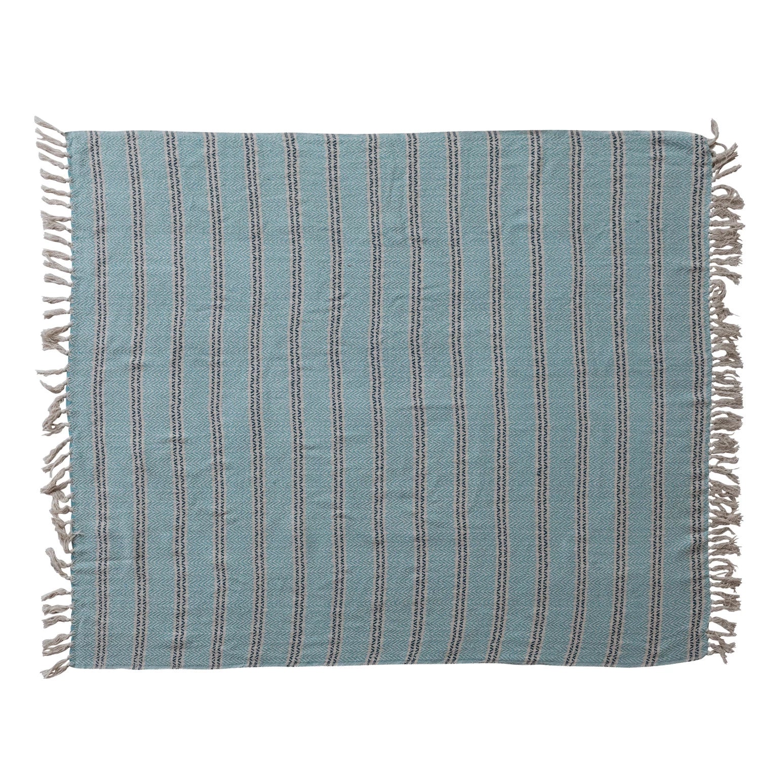 Woven throw made with recycled cotton, featuring broad light blue stripes and thinner cream and black stripes, all textured with a subtle zigzag. Great for decor styles ranging from modern to coastal to farmhouse and boho, this throw blanket can be layered on a bed for a little extra warmth and weight, or draped over a couch or chair to add color and coziness.