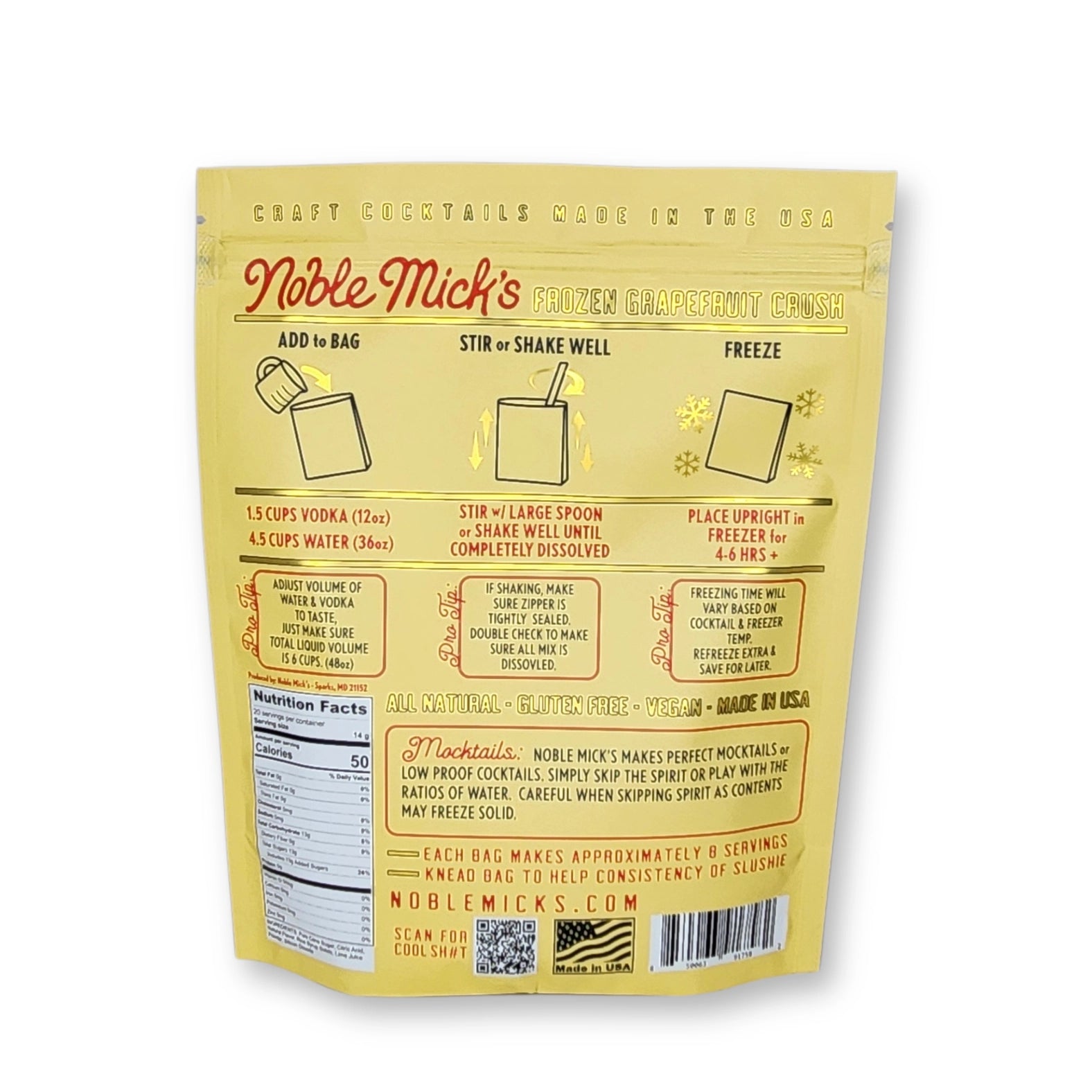 Frozen Cocktails don't get easier than this! Each bag makes 8 servings. No blenders ever! Simply add 12oz Vodka and 36oz water shake or stir and throw in the freezer. Then serve right from the bag.