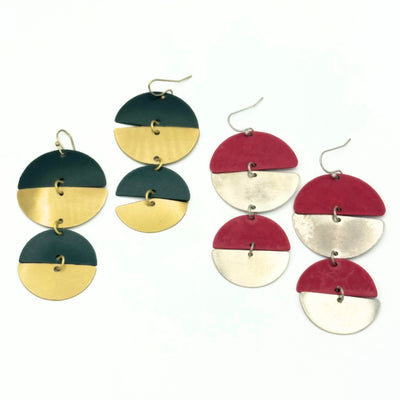 These are very lightweight for their bold size. The half circles connected together create an organic vibe, while the alternating colors and metallic create a structure for these trendy statement earrings.
