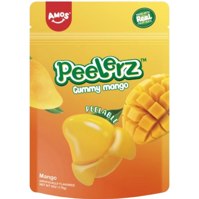 Amos Peelerz Mango peelable gummy candy. One of Tik Tok's viral trends! Made with real fruit juice, these sophisticated gummy mangoes are available in flavors that offer a soft texture, juicy taste, and fruitiness. This candy offers a playful twist on enjoying the beloved fruit, with its unique outer skin that can be peeled away to reveal a softer, bouncy solid gel layer.