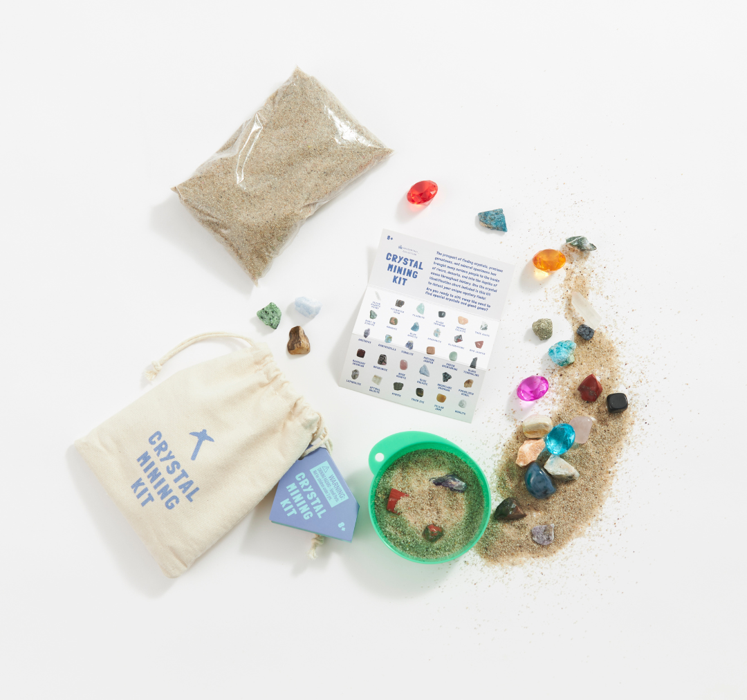 Mining kits are a compact and easy way to offer an engaging geological experience for young minds. Sift through sand to discover a wide variety of crystals, then use the included guide to match each of your discoveries and learn their names!