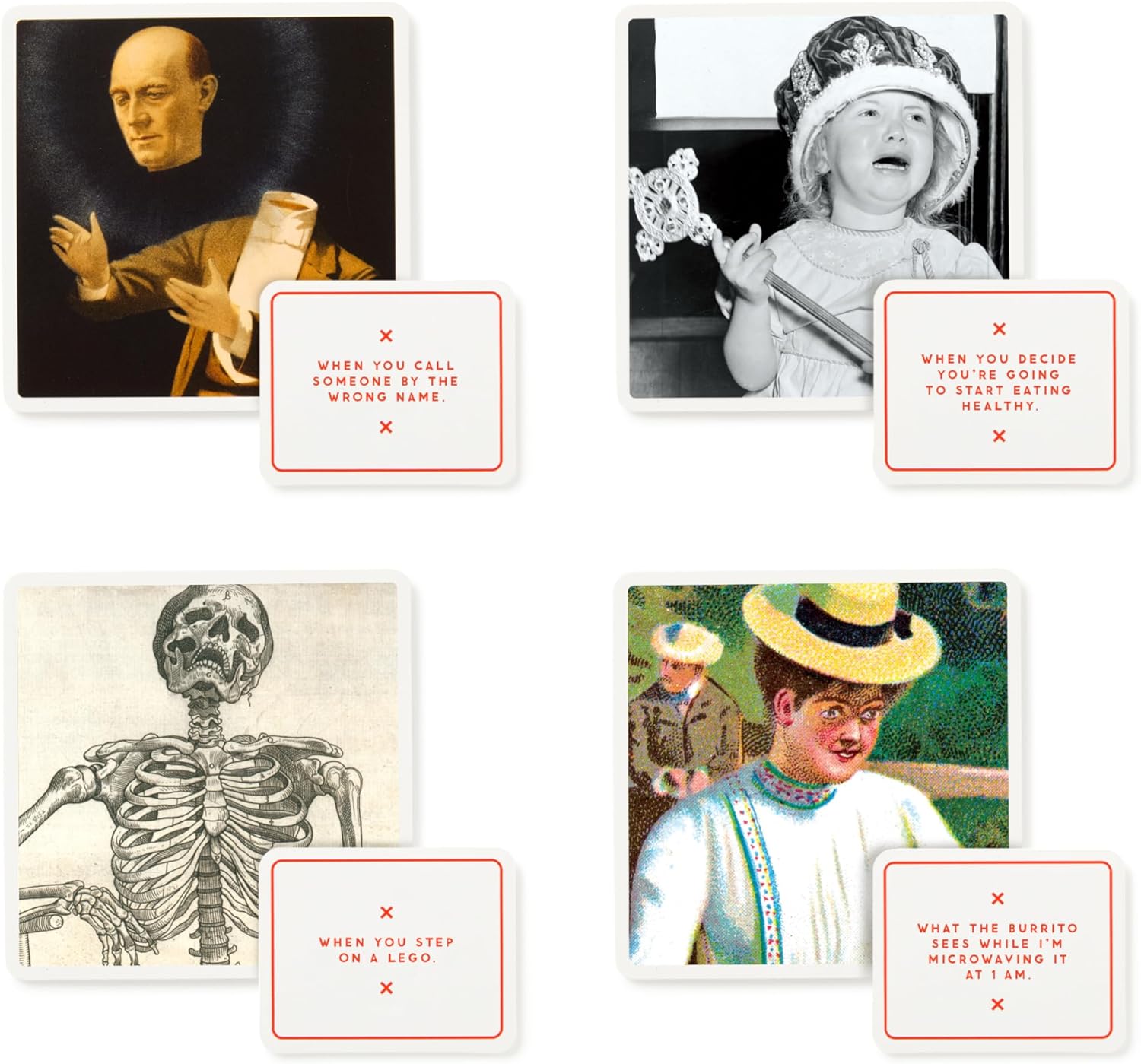 - 300 double-sided caption cards full of absurd quotes, fake headlines, and imaginary diary entries