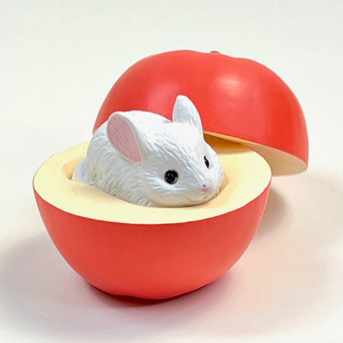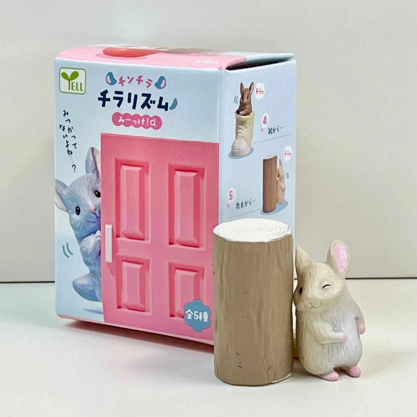 Adorable chinchilla figurines each peeking out from a different hiding spot, be it behind a door or tree stump, or inside a paper bag, shoe, or apple!