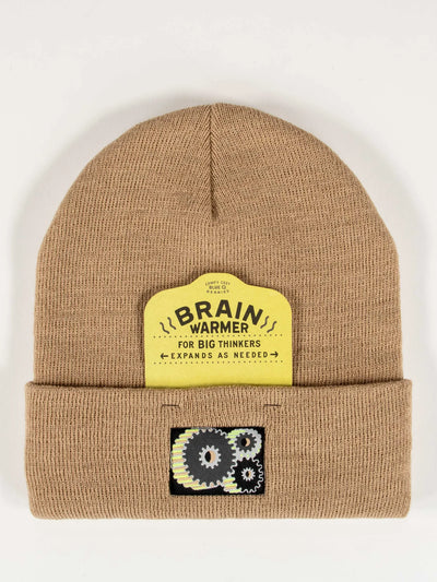 Just over here, trying to accommodate the geniuses of the world... This stretchy, light brown hat is knit from 100% recycled polyester and features a soft, sewn-on patch. It comes packaged with a removable card that reads: "Brain Warmer // For BIG Thinkers // <-- Expands As Needed-->"