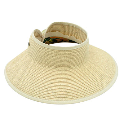This adjustable, breathable open-top sun hat (aka, visor) is made of 75% Toyo straw and 25% Polyester. While the top of this visor is understated in its natural straw color, the underside features a fun pattern of tropical flowers and leaves. With its 3.5" brim and its crushable and packable design, it's the perfect travel companion for the pool, the beach, or any outdoor activities!