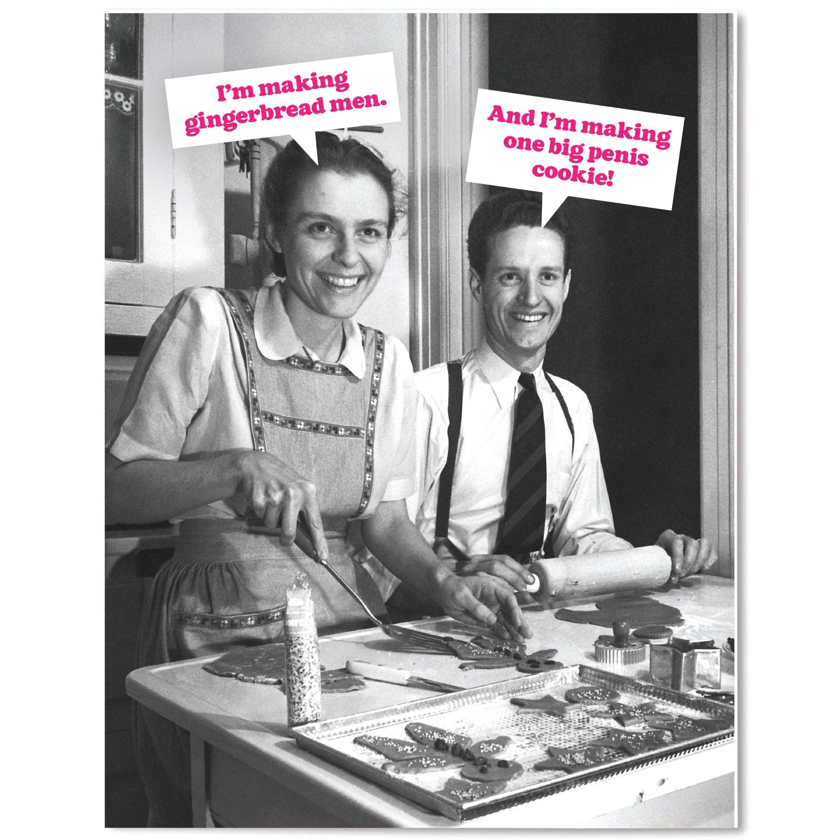 Front reads: I'm making gingerbread men. // And I'm making one giant penis cookie!