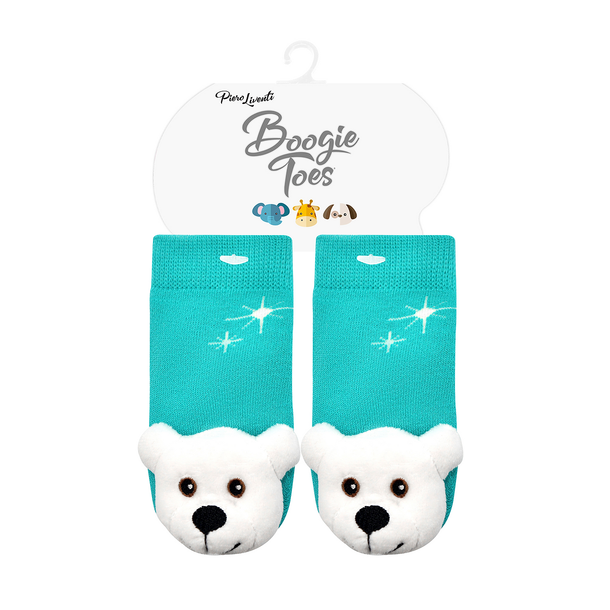Boogie Toes are the perfect addition to any kid wardrobe and make great gifts too! This pair features friendly white polar bear faces on aqua blue socks. Rubber grip-bottoms provide traction for new walkers and stuffed characters double as rattles. Pre-washed and pre-shrunk to ensure comfort and durability.