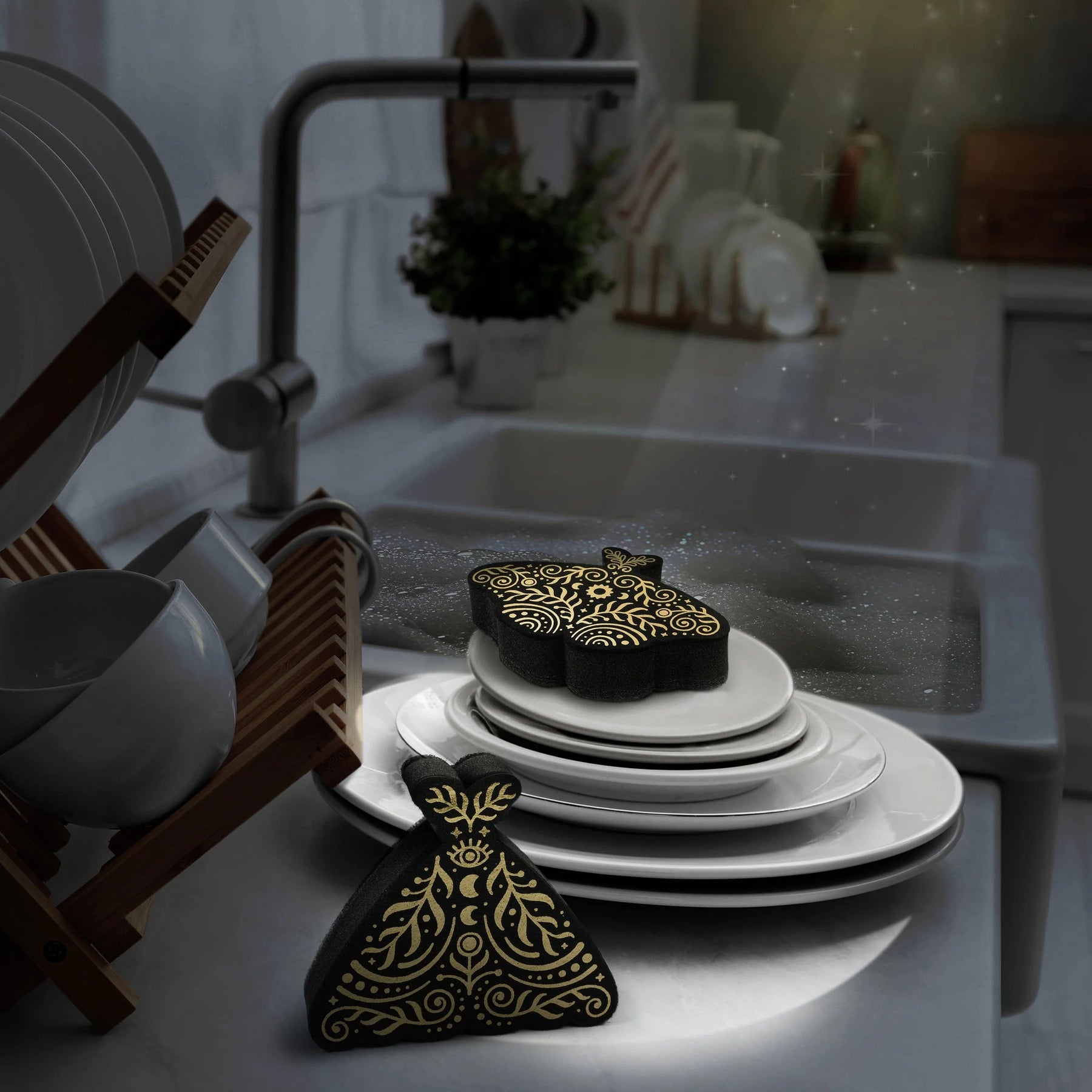 Make your dishes sparkle like a starry sky with Fred’s Night Scrub sponges. Featuring metallic celestial details and three hardworking layers, these elegant moth-shaped sponges are tough on grime and designed to shine. Set of two, packed on a gift-ready backer card with gold accents.