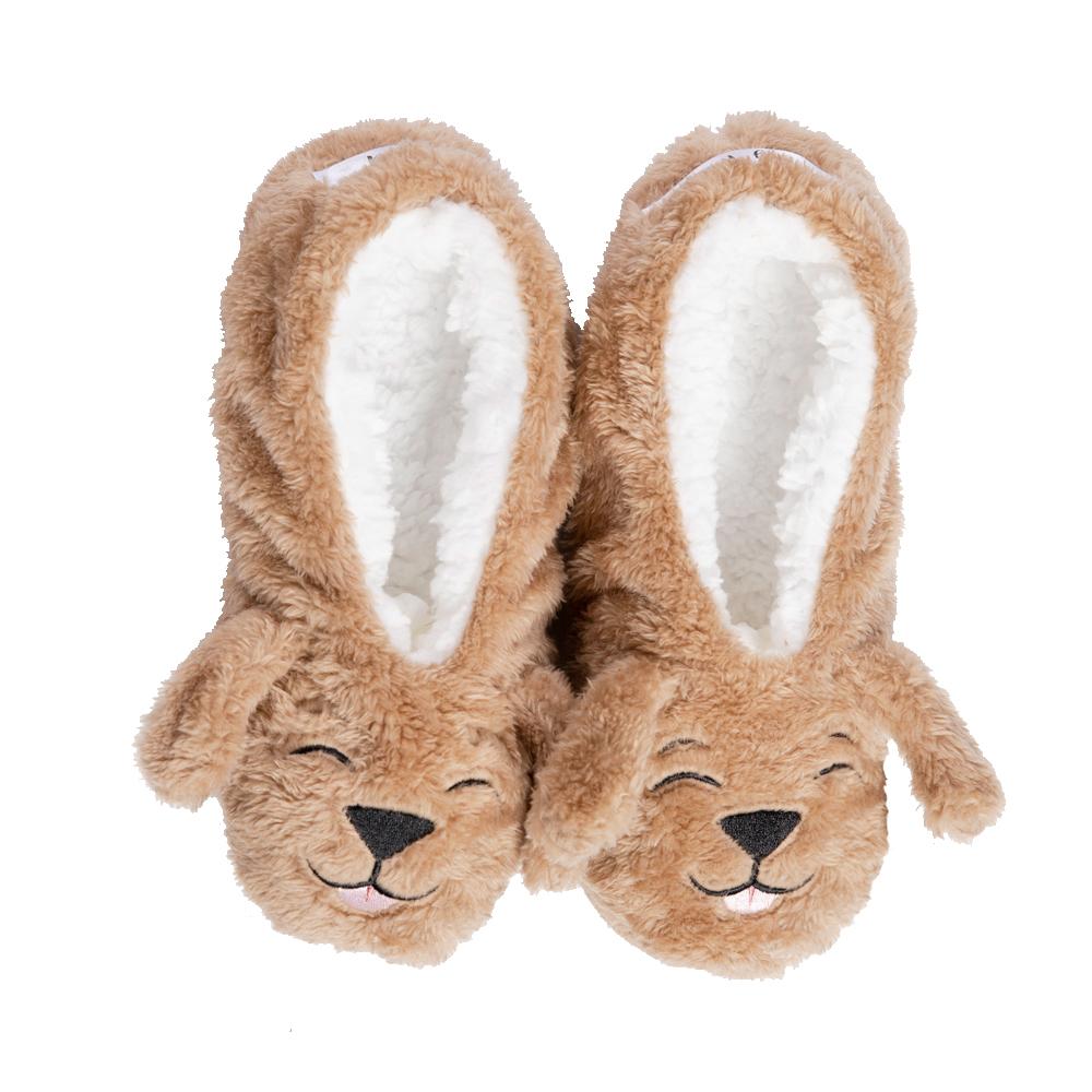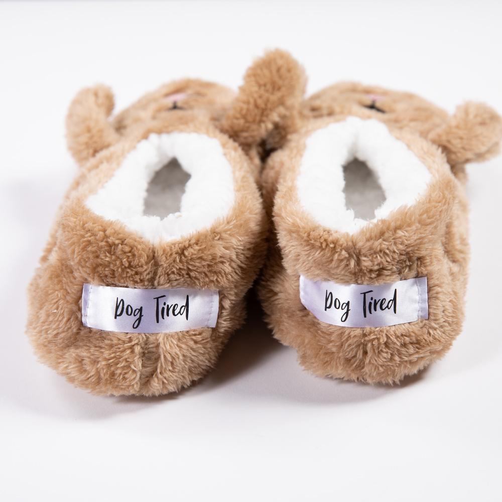 These cute brown slippers feature an adorable puppy design in front and "Dog Tired" messaging on the back. These cozy footsies will be friends to cold toes everywhere!