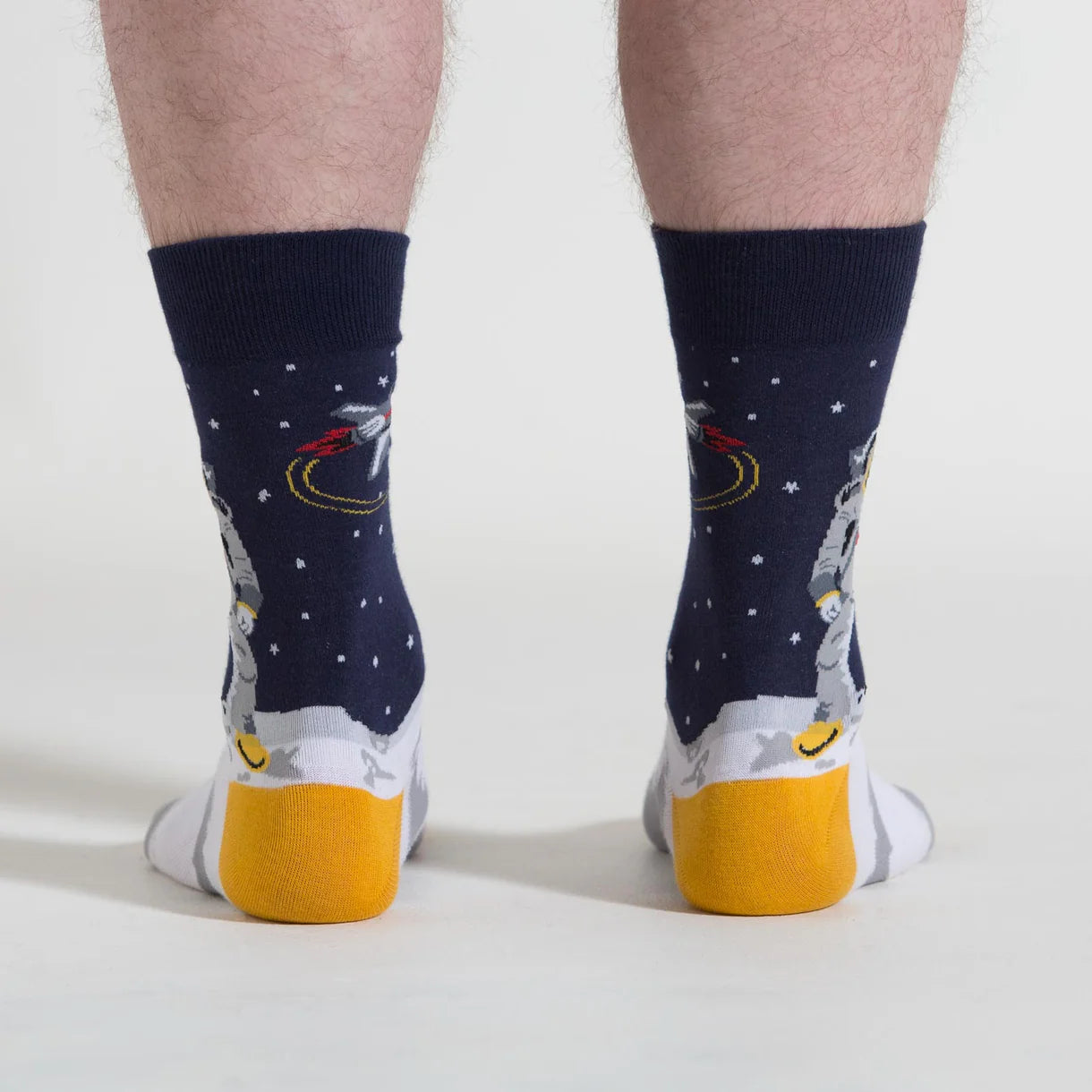 These astronaut socks feature the shiny white surface of the moon, a rocketship zooming through the stars, and one very cool moonwalker.