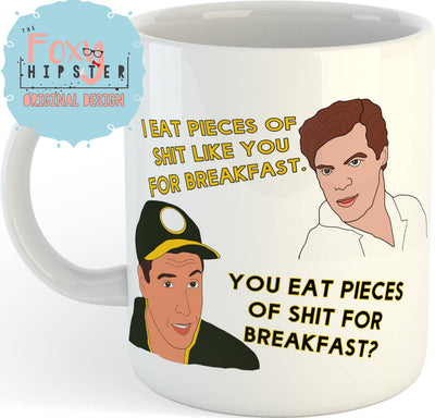 Text reads: I eat pieces of shit like you for breakfast. // You eat pieces of shit for breakfast?