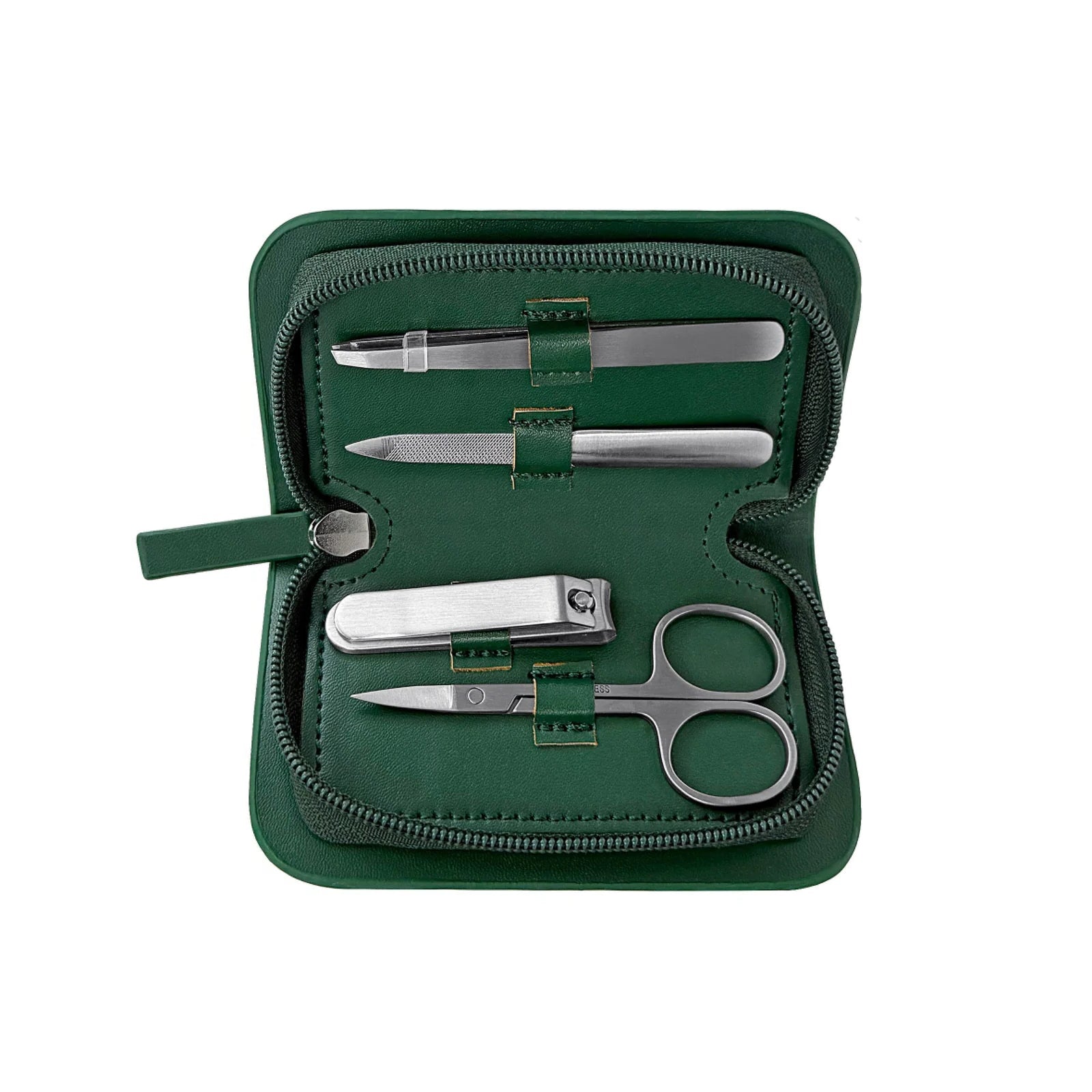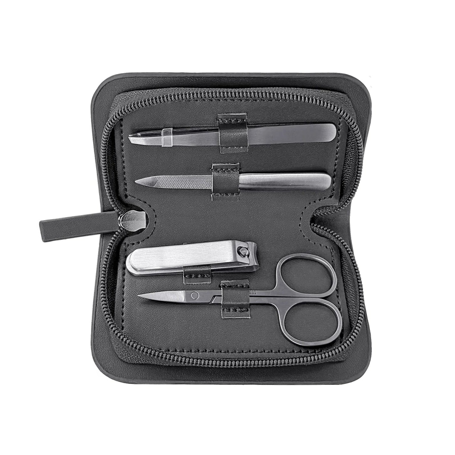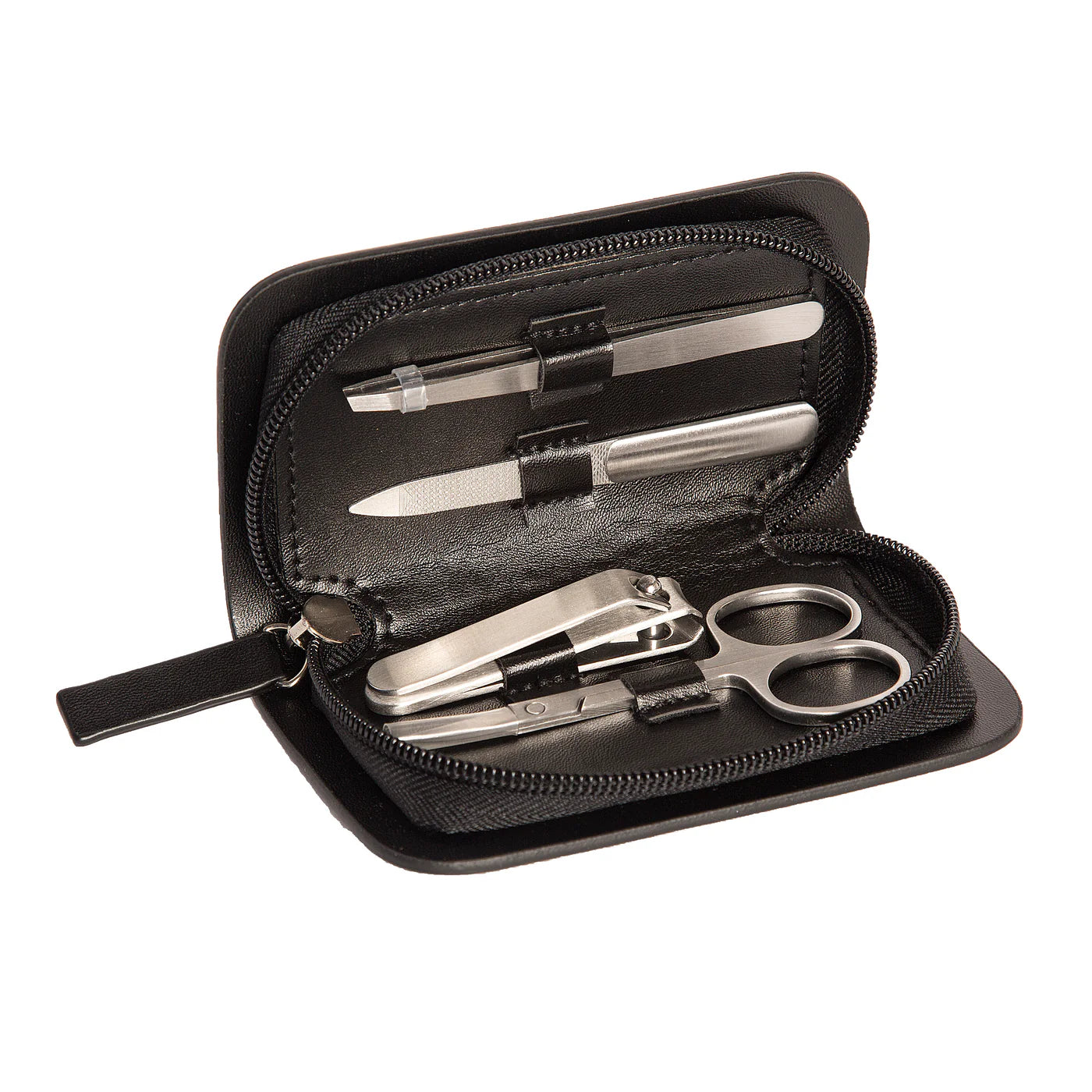 A unisex manicure set made for your travel needs. Bound in a zip-up leather case, this set includes essential grooming tools: nail scissors, nail clippers, nail file, and tweezers. Practical and portable so you can take it on-the-go; clean and tidy so you can keep your tools organized at home.