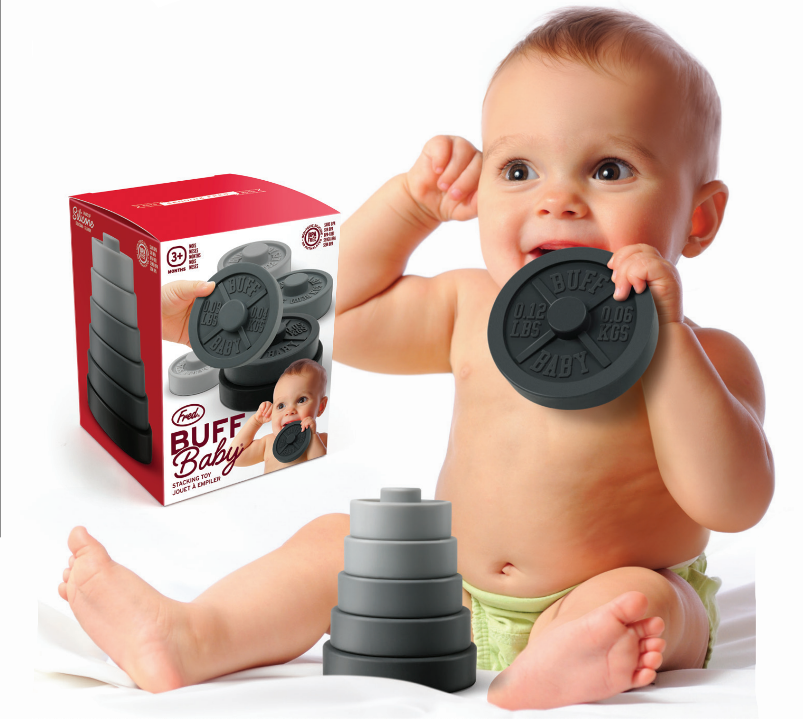 Little lifters unite! Fred's Buff Baby Weight Stack brings gym vibes to playtime with soft, stackable “plates” made from baby-safe, BPA-free silicone. Designed to build coordination, soothe sore gums, and pump up the cuteness, each piece is perfectly sized for tiny hands.