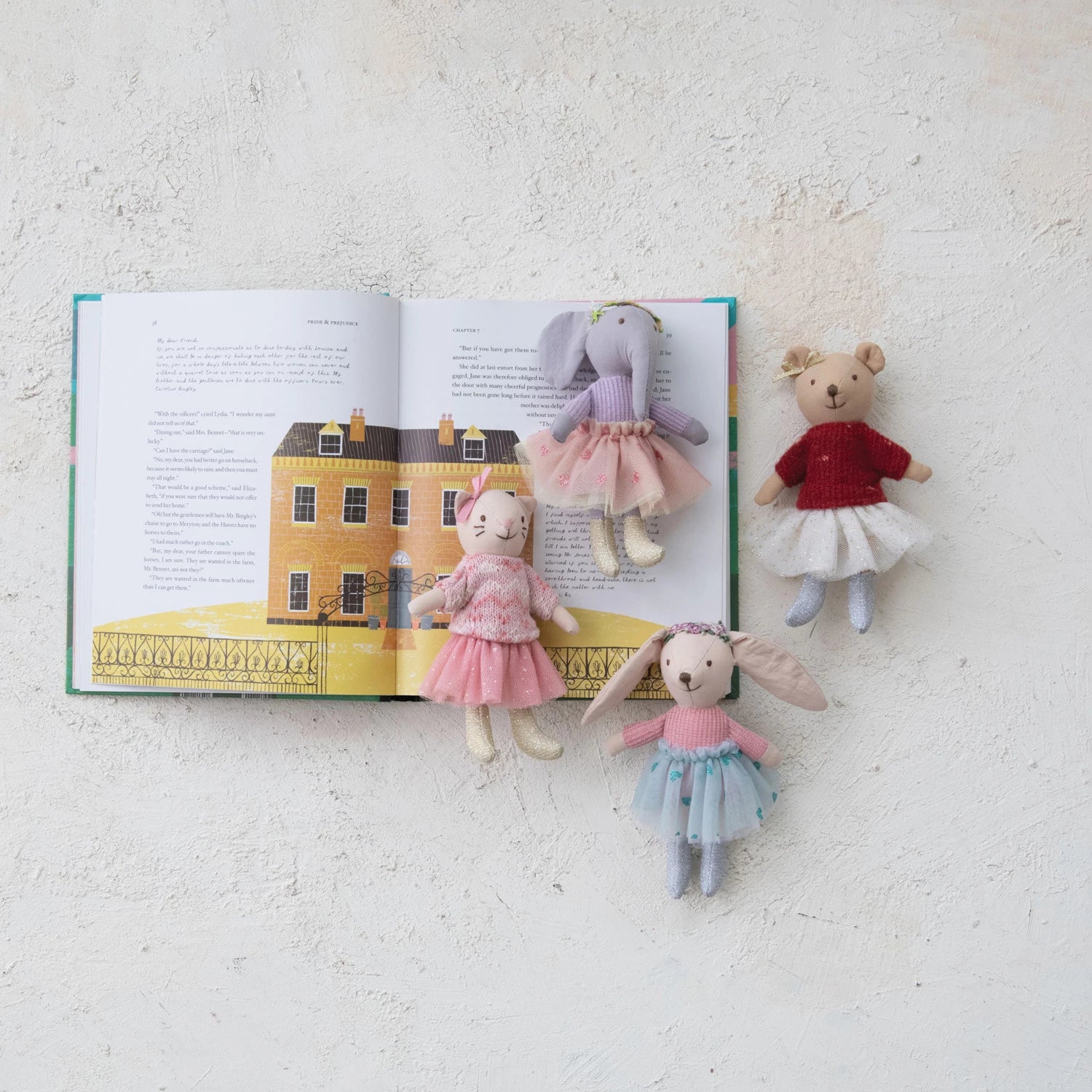 Styles include an elephant, a bunny rabbit, a kitty cat, and a bear, each wearing a sweater, tulle skirt, and hair bow or flower crown. Dolls measure approximately 3"W x 7"H x 2"D each.
