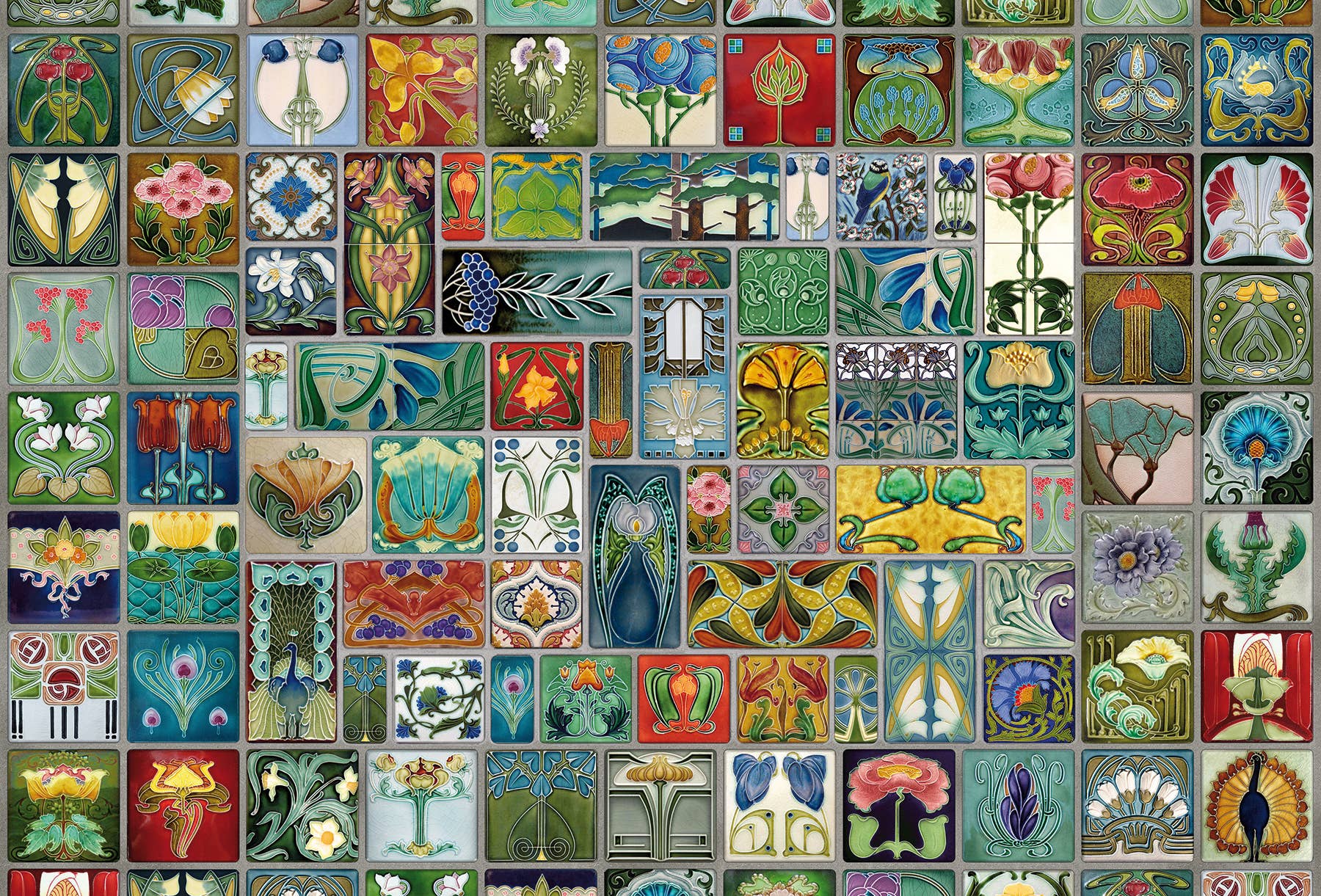 Tilework is a collage of art nouveau tiles in various sizes. There are pops of color to help aid in assembly, but with a lot of blues and greys, it's sure to be a challenge at 2000 pieces! Plus, this puzzle uses random-cut pieces, meaning each puzzle piece looks different.
