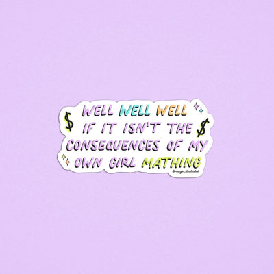This cheeky sticker features the hand lettered phrase "well well all if it isn't the consequences of my own girl bathing" in shades of purple, blue, orange, and green with black drop shadow. The quote is surrounded by dollar signs and stars. Perfect for the girls that get it!