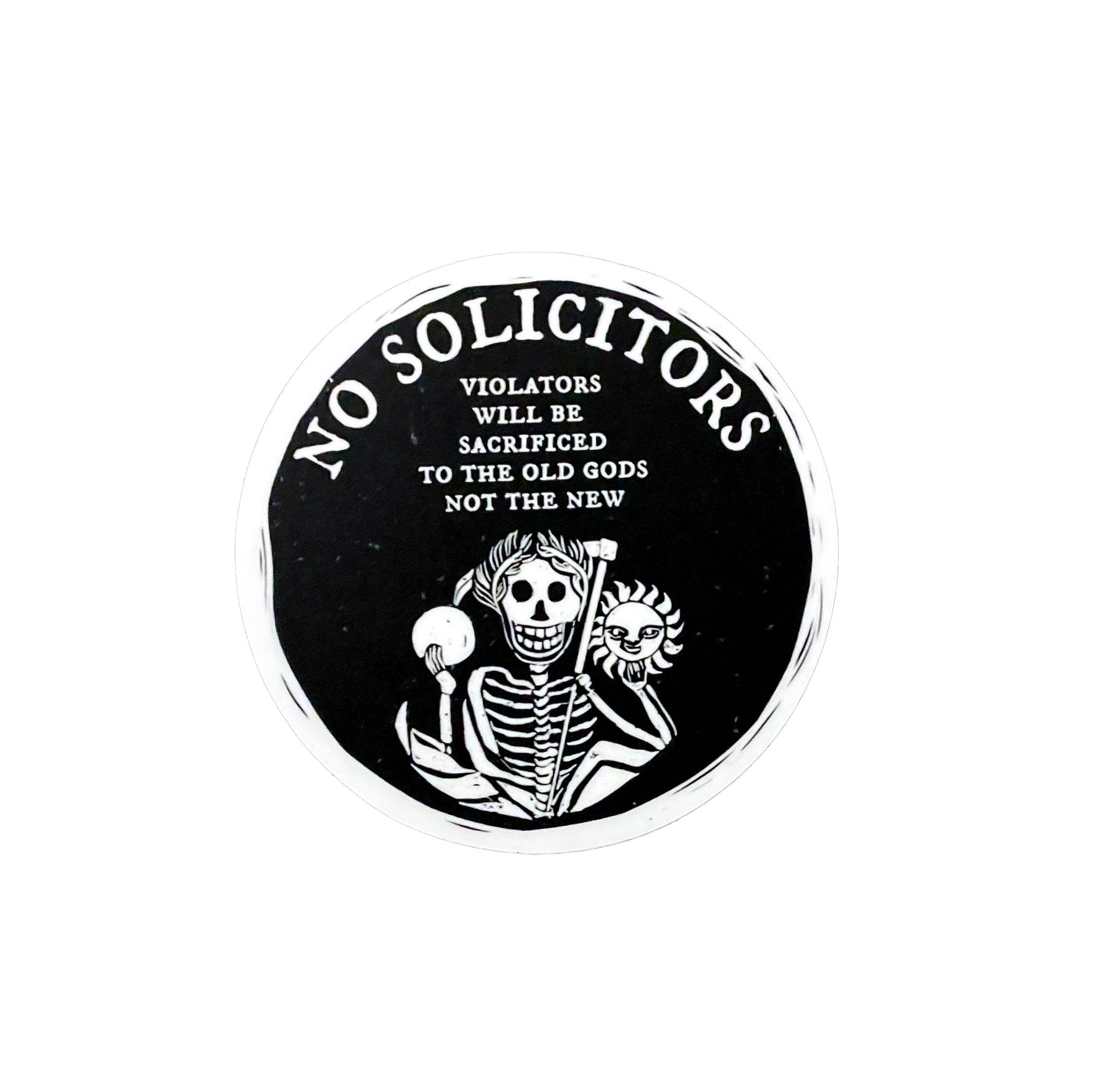 This woodblock print-style sticker reads: "No Solicitors. Violators will be sacrificed to the old gods not the new"