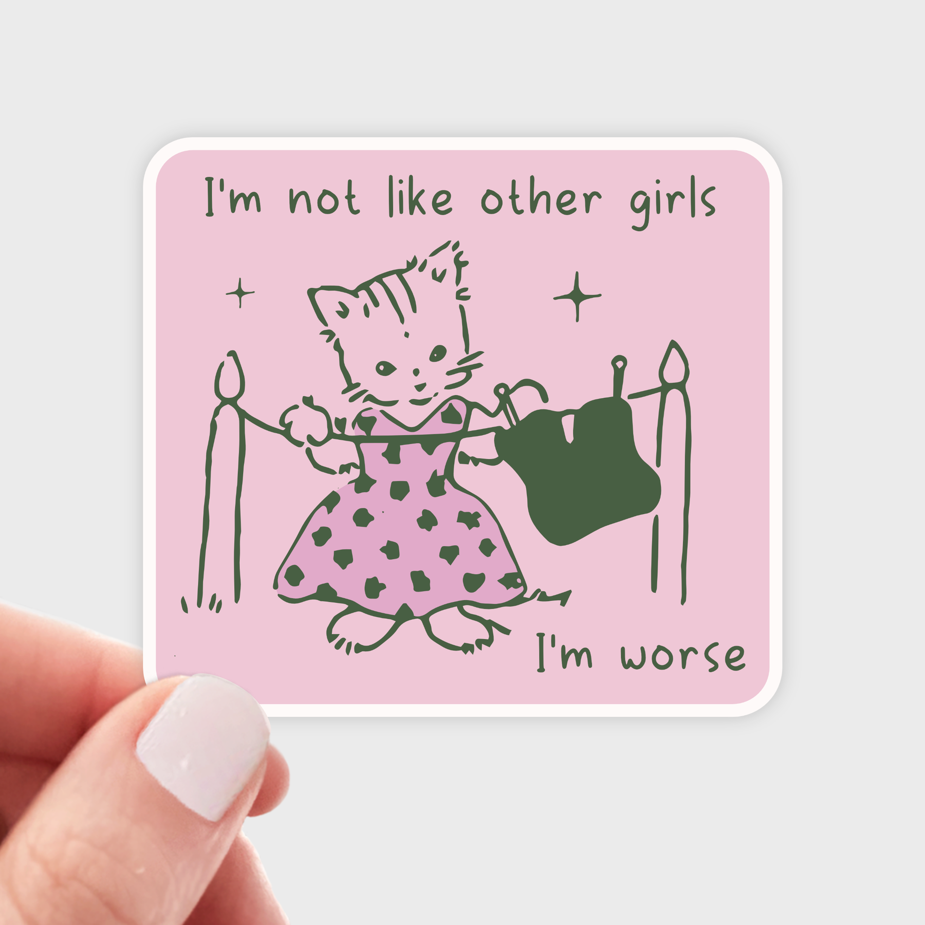 Sticker of a kitty cat in a dress, hanging laundry on a line.
