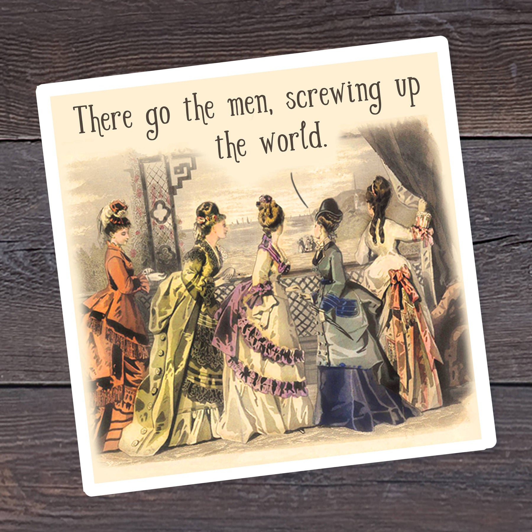 A group of ladies in Victorian garb look out the window under the text, "There go the men, screwing up the world." Sigh. If only it weren't true...