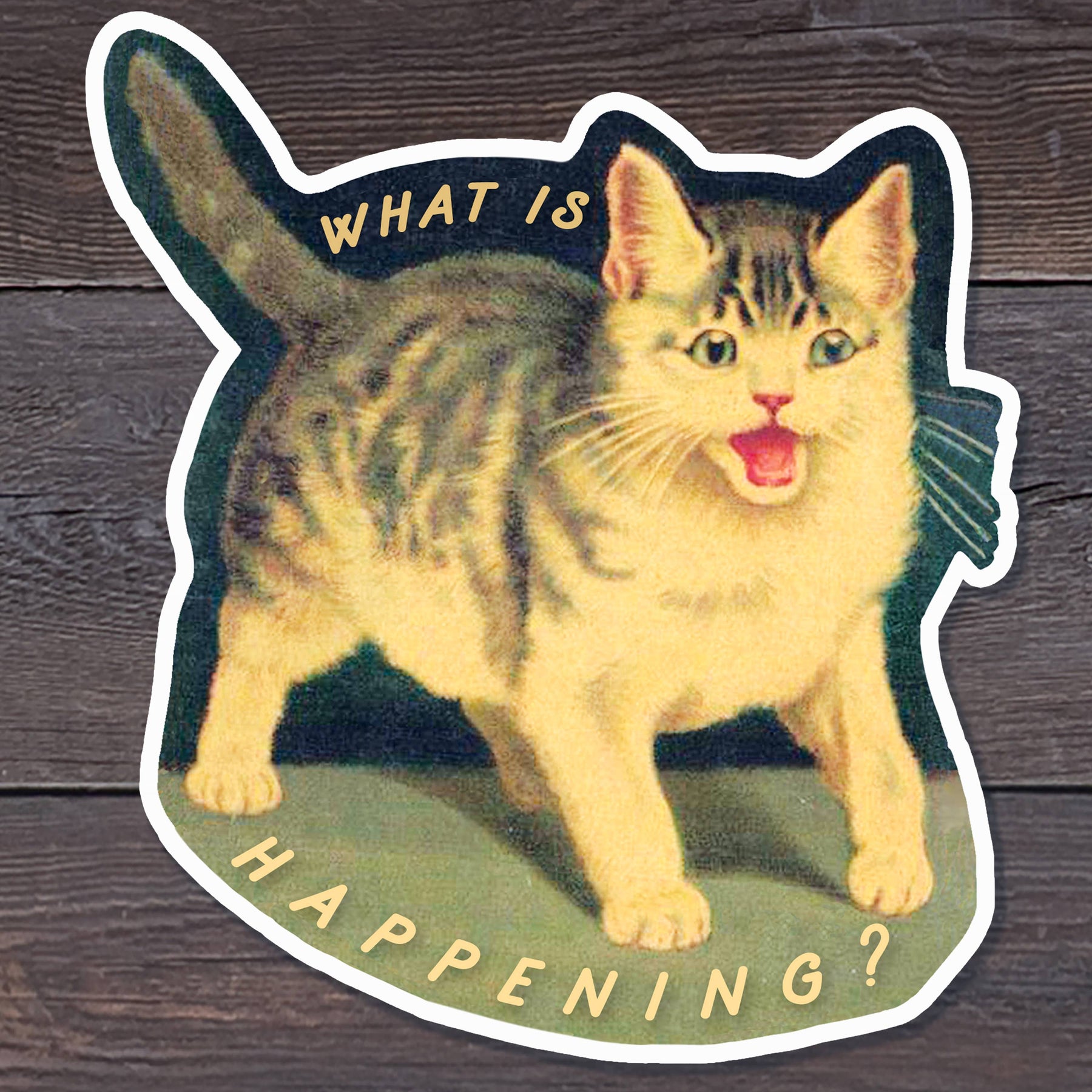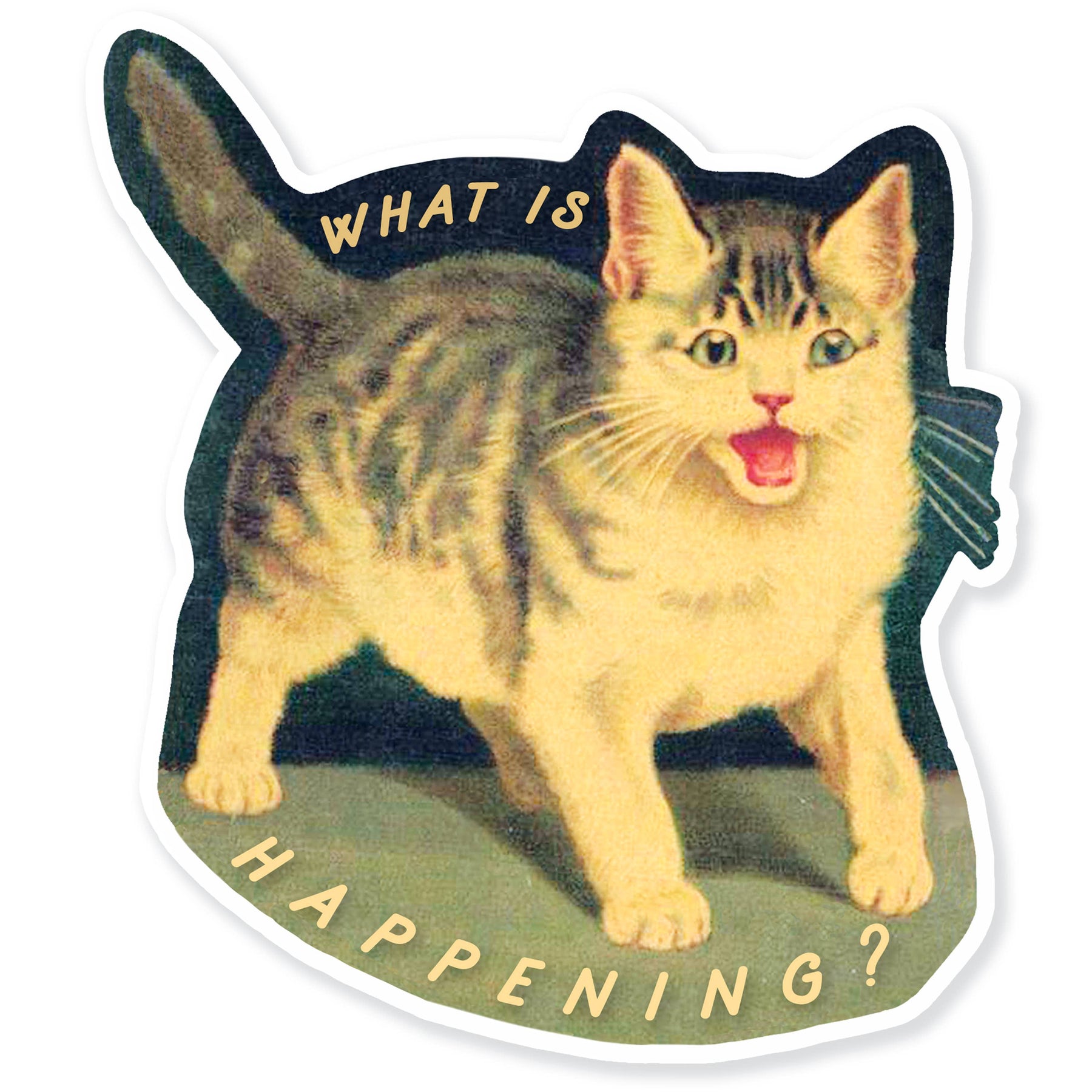 A vintage illustration of a screeching cat paired with the words, "What Is Happening?" The kind of sticker that really captivates the current moment for us.