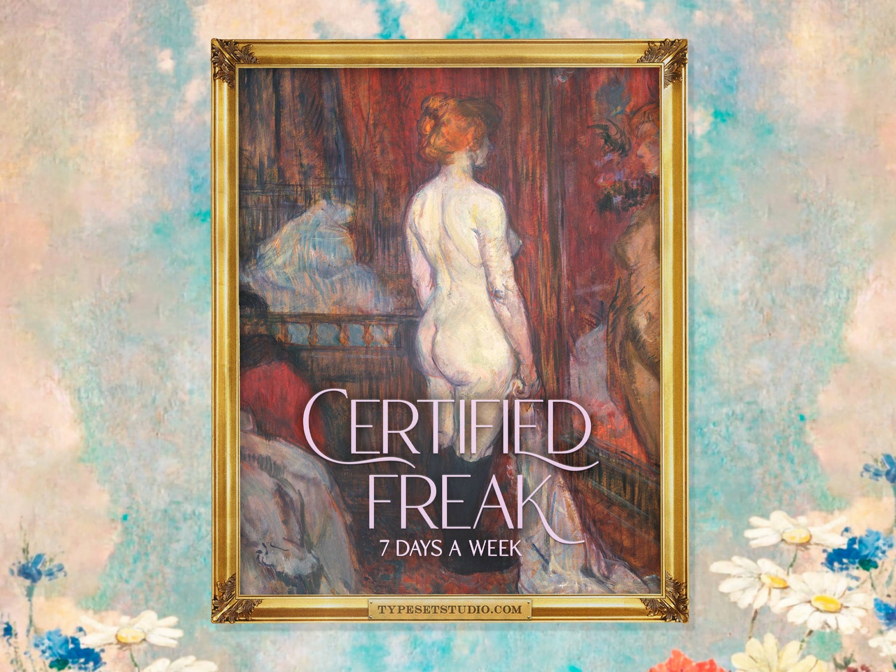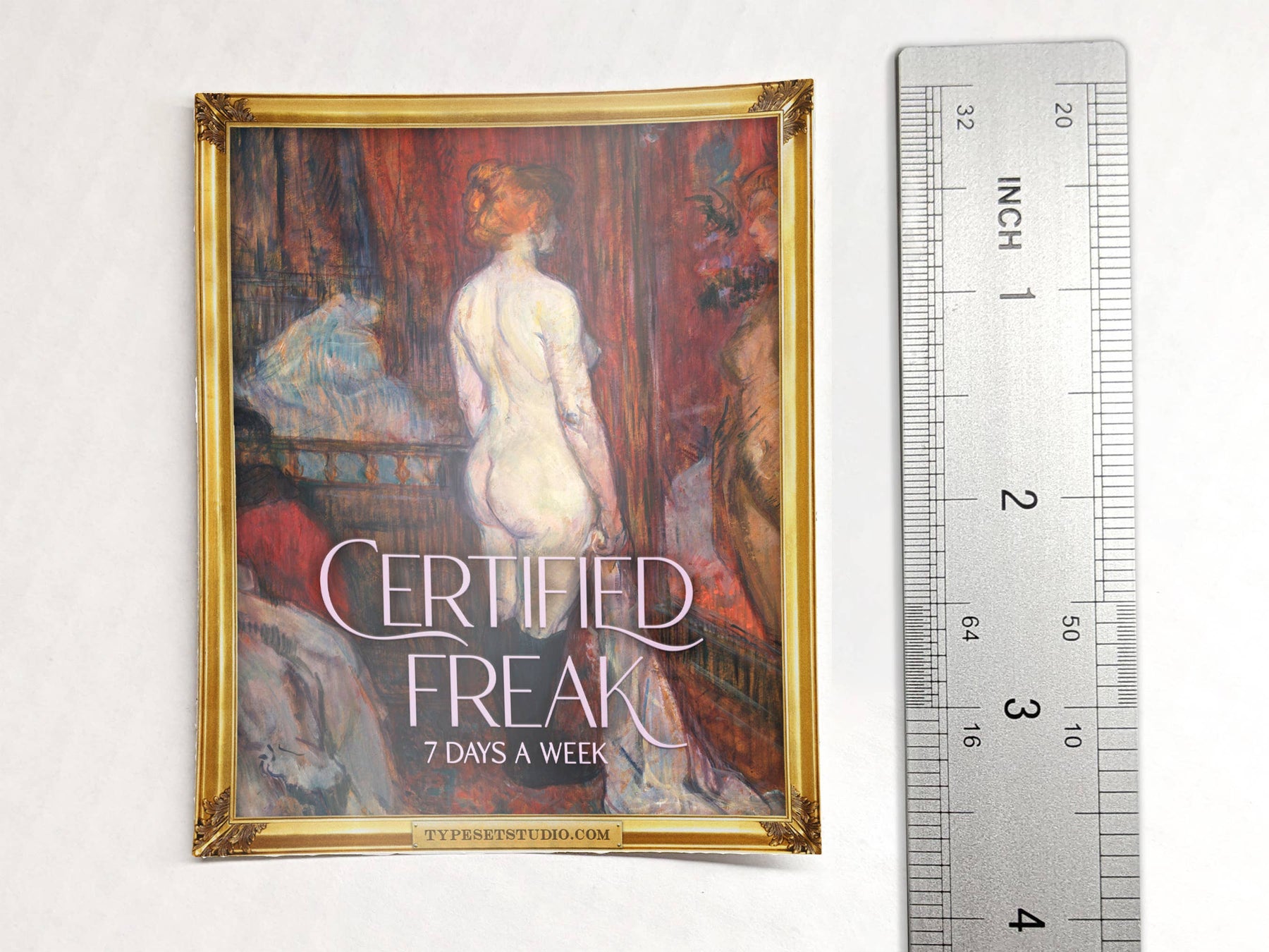 This parody, mini painting sticker features an art classic by Toulouse Lautrec, Portrait of a Woman Before a Mirror, with the phrase "Certified Freak 7 Days a Week".