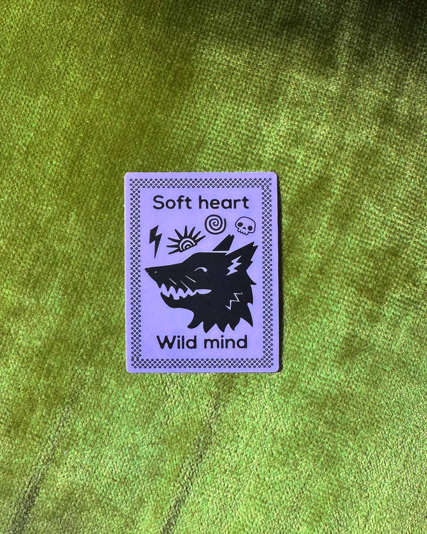 A sticker for when you're very sensitive but also a little chaotic. Picture of a wolf and some doodles on a purple background.