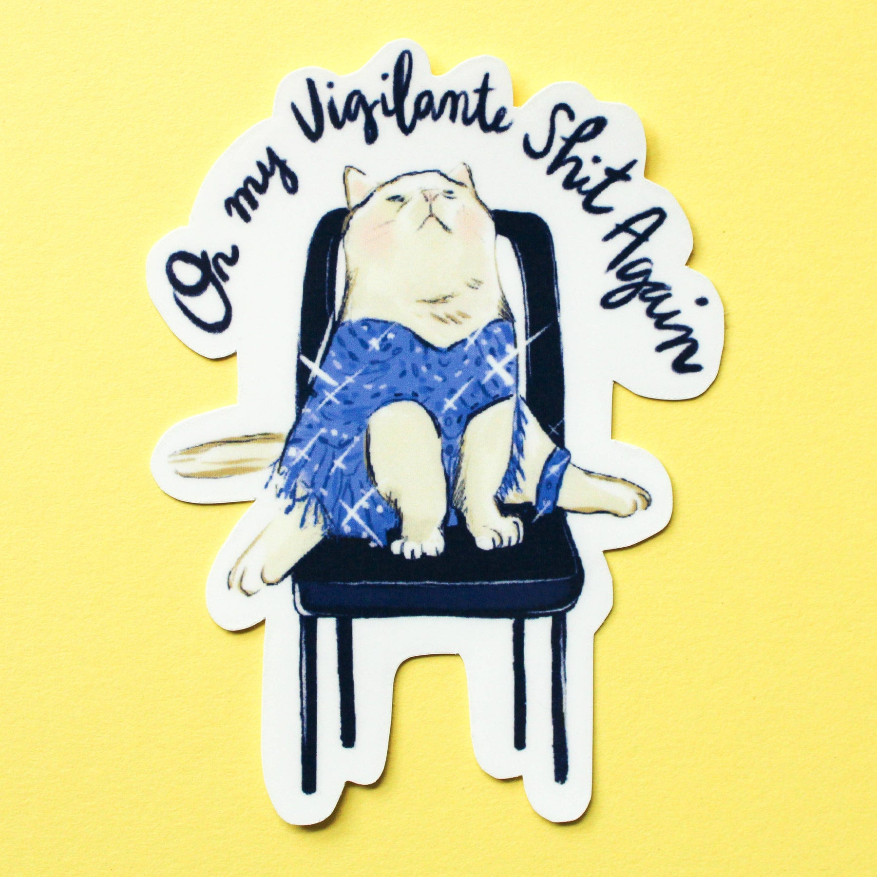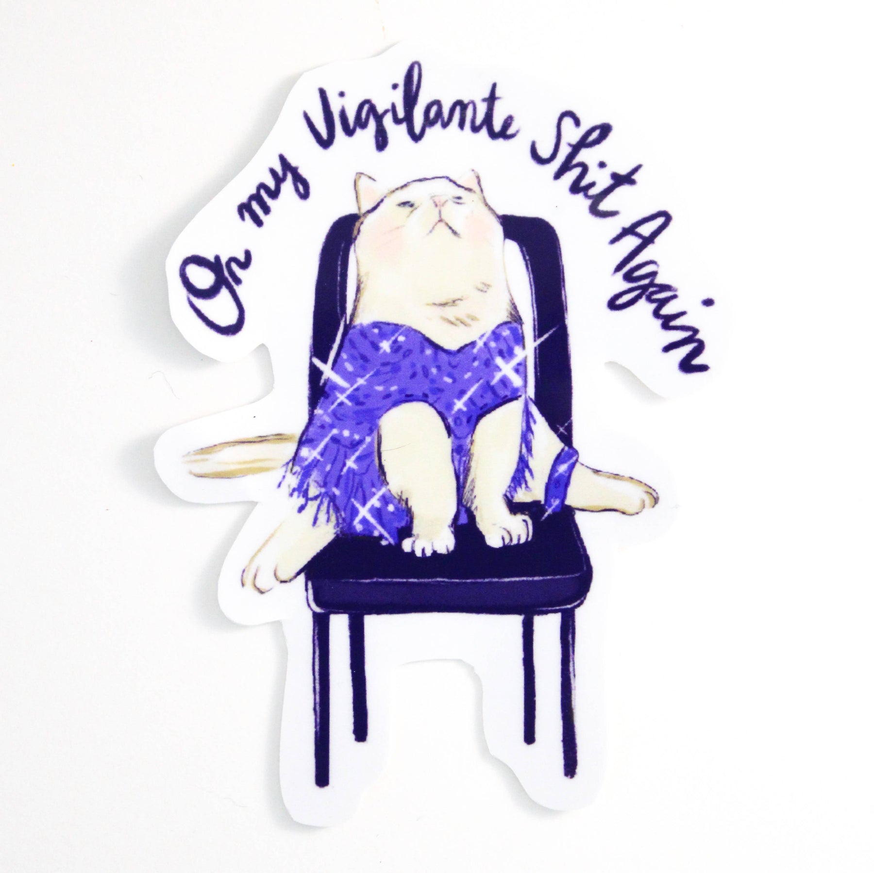 Sticker of a cat in a glittery outfit, sitting on a chair under the text, "On my vigilante shit again".