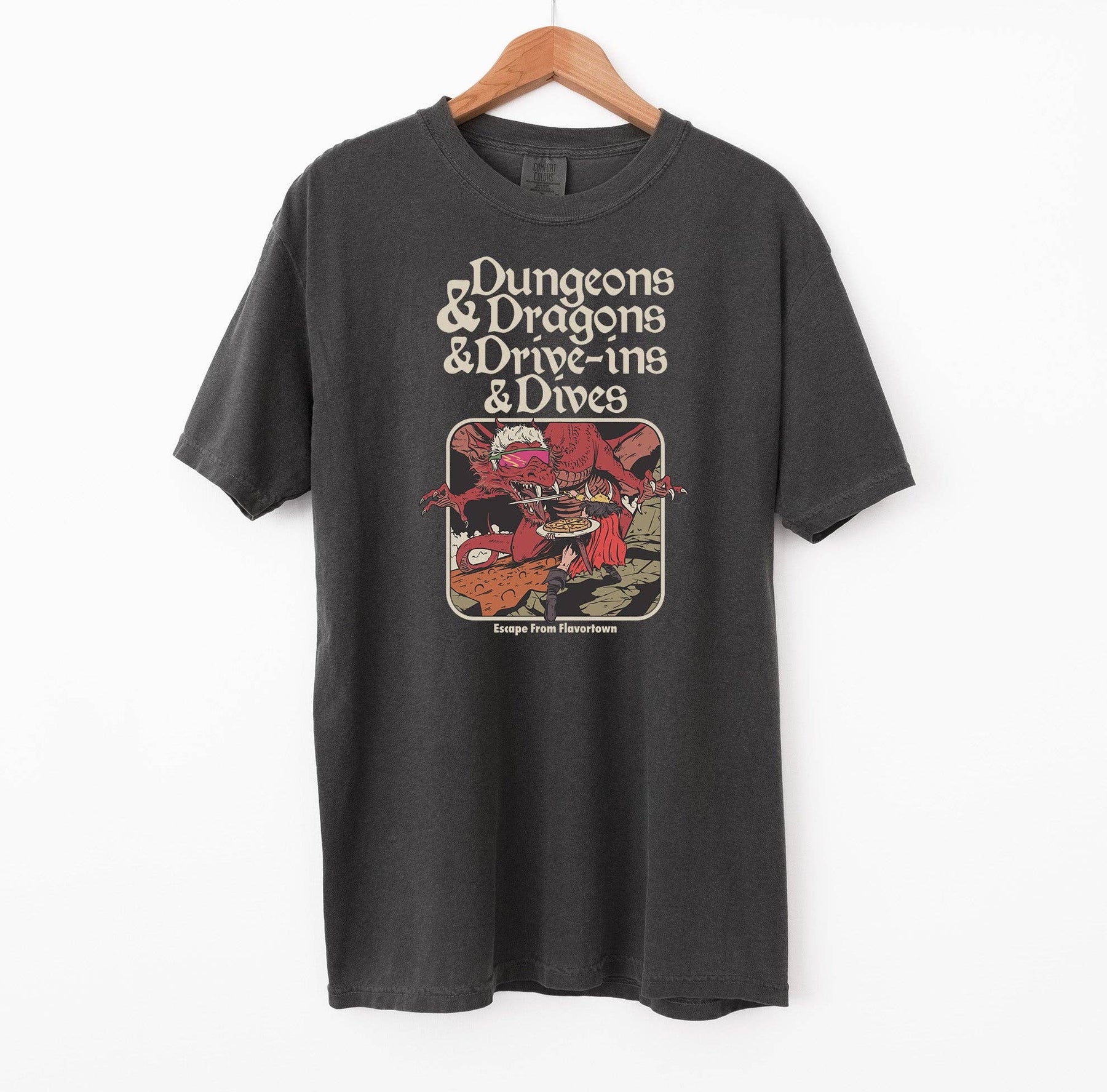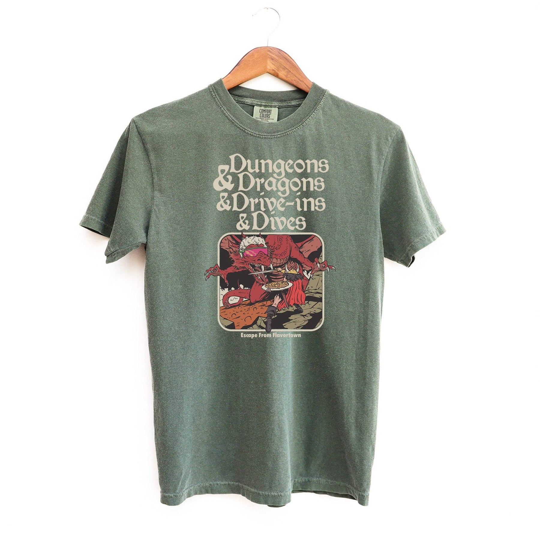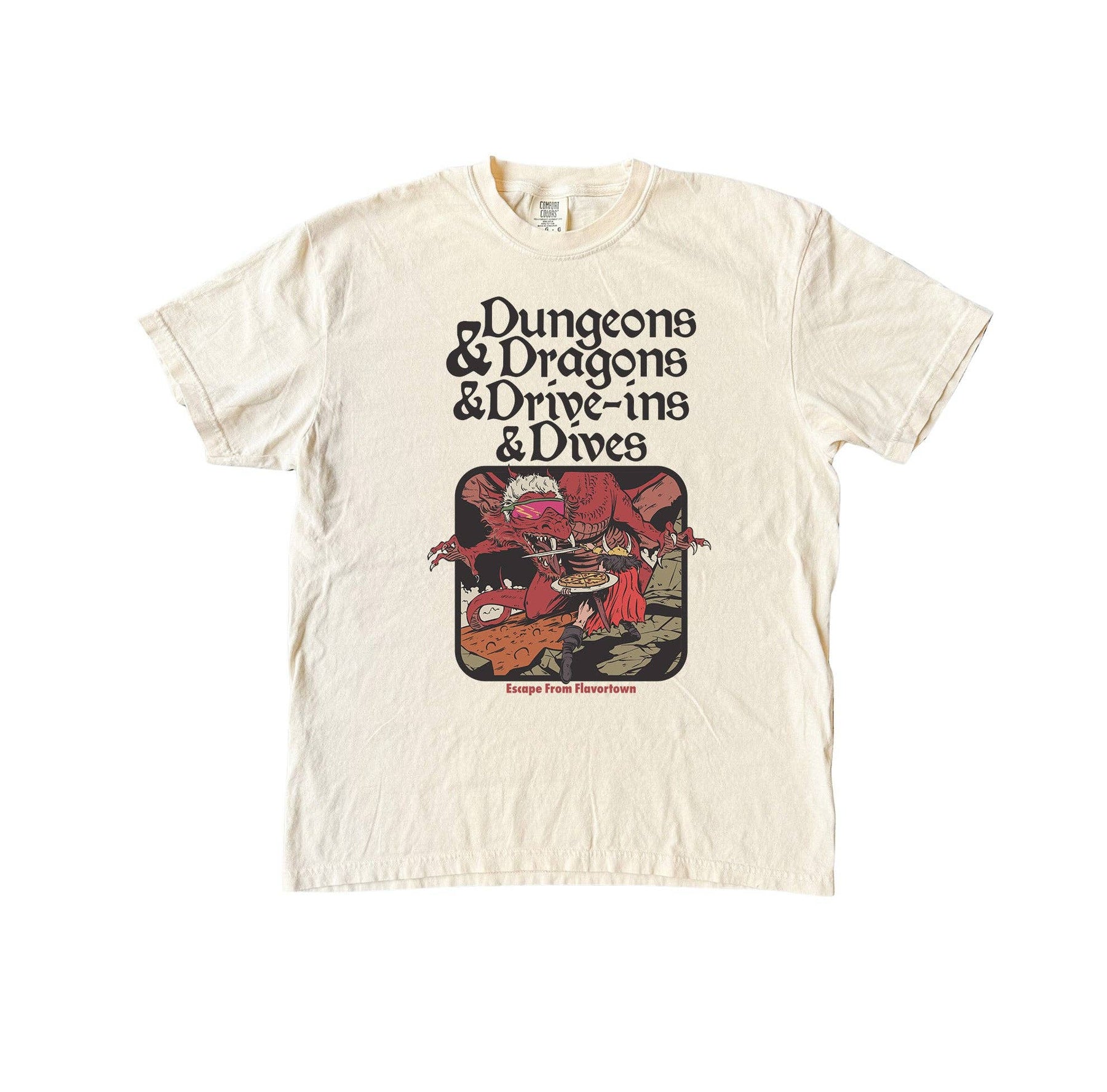 This funny tee reads, "Dungeons & Dragons & Drive-ins & Dives // Escape From Flavortown" alongside a picture of a pizza-holding swordsman fighting a (fiery) dragon with white spiked hair and the coolest of cool-guy sunglasses. It really doesn't get better than this.