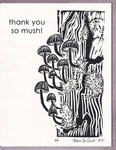 This card was made from a black-and-white print of mushrooms growing happily on the side of a tree, with the text "thank you so mush!"
