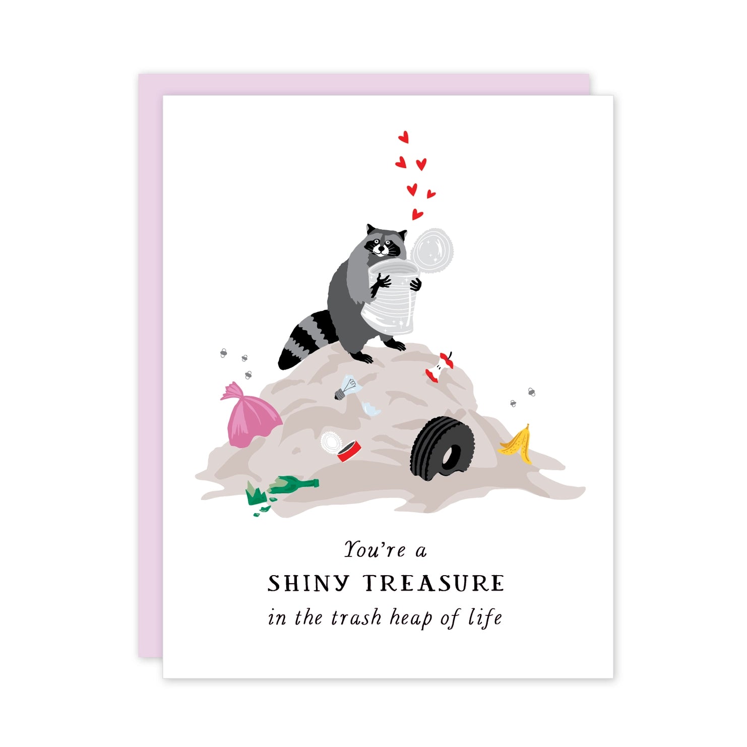 Share your love and admiration with this funny, somewhat dark, but very endearing card featuring a raccoon on a pile of garbage.