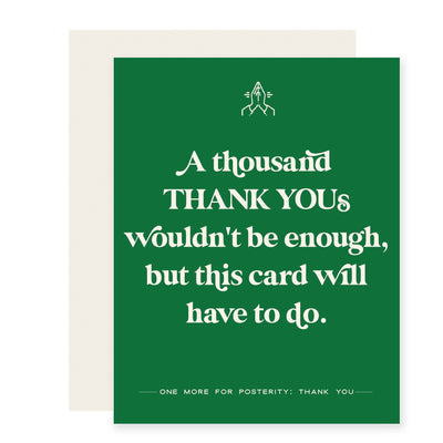 Reads "A thousand thank yous wouldn't be enough, but this card will have to do. // One more for posterity: thank you."