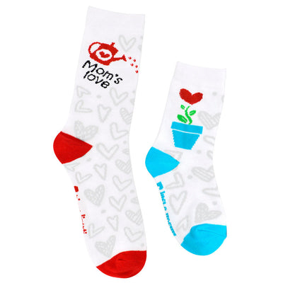Mom's love makes little ones grow! It's such a sweet sentiment expressed on this sock set. Adult socks feature subtle gray hearts and a bright red watering can graphic pouring love. Kid's socks have the same pattern with a flower blooming from a turquoise pot.
