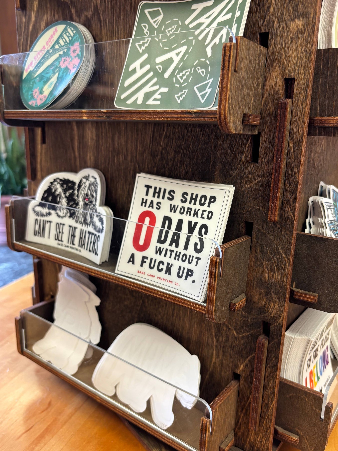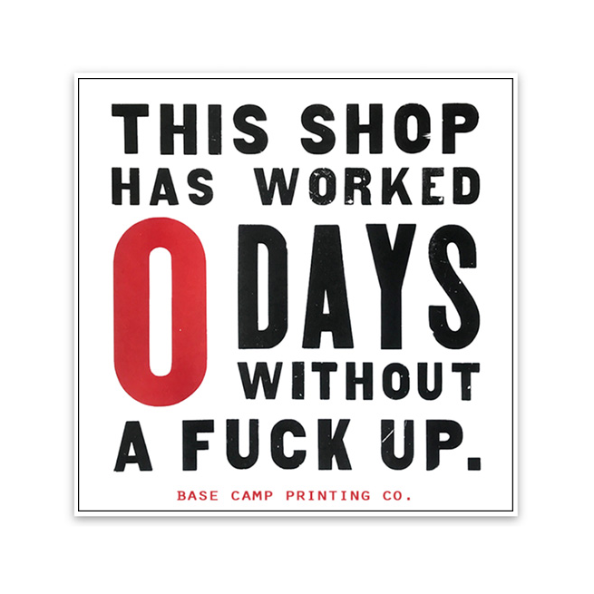 This square sticker reads, "This shop has worked 0 days without a fuck up."