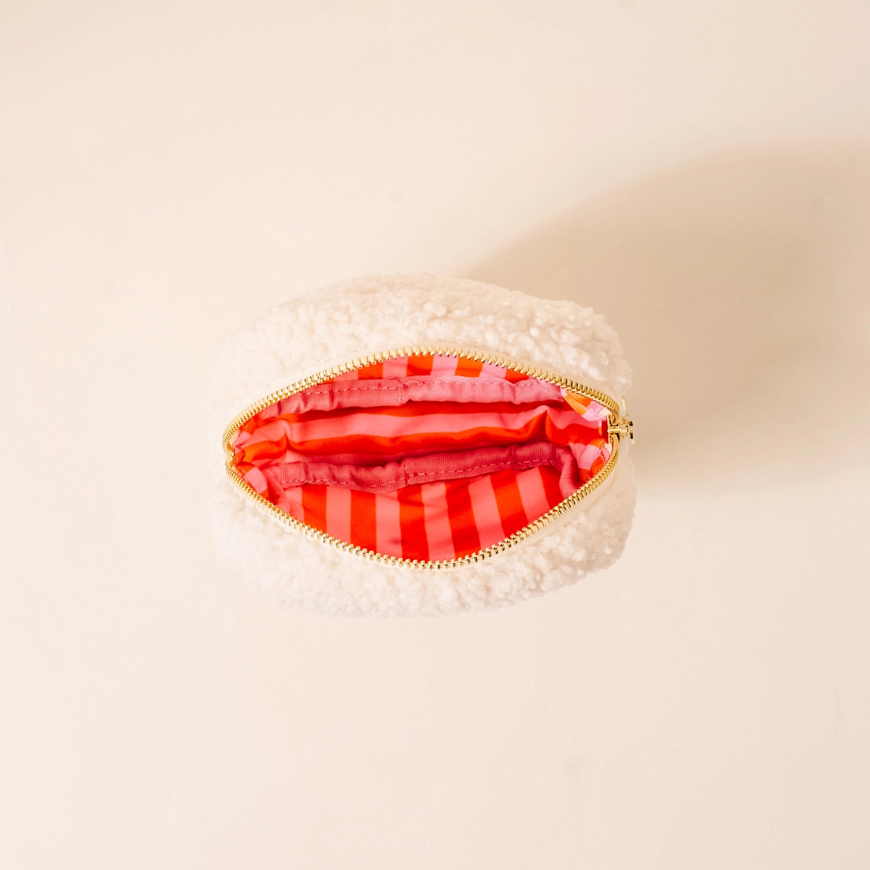 Start off pumpkin season organized with this candy corn Teddy Pouch. Made from soft sherpa material, it features a darling, wipeable lining inside and gold zipper details. Plus, it pairs perfectly with our fall circle and rectangle teddy pouches for added convenience and seasonal style.