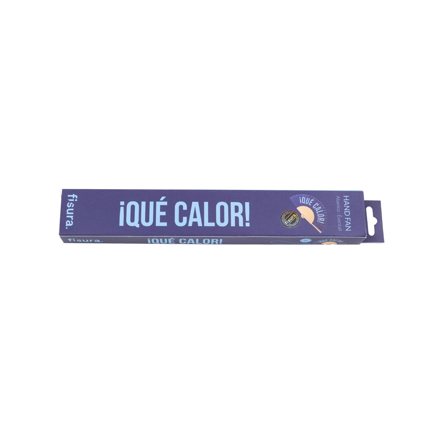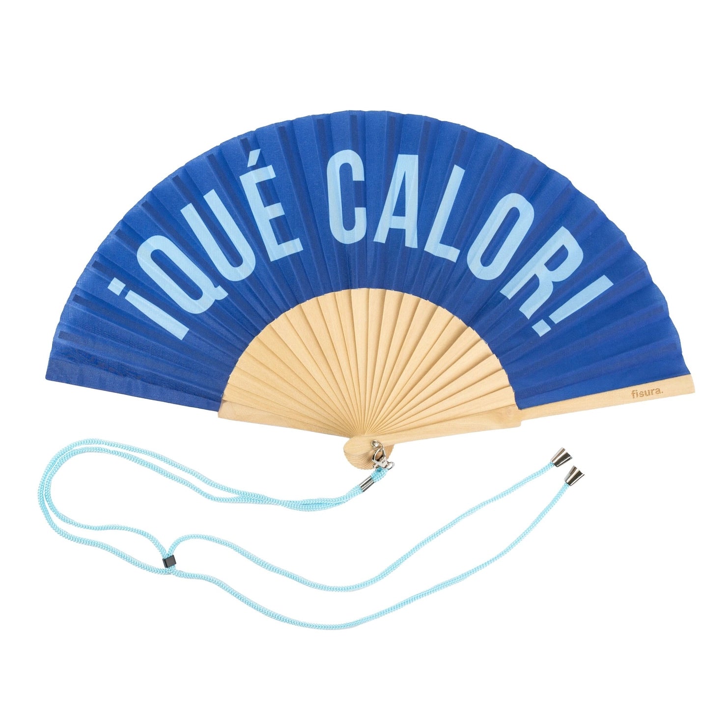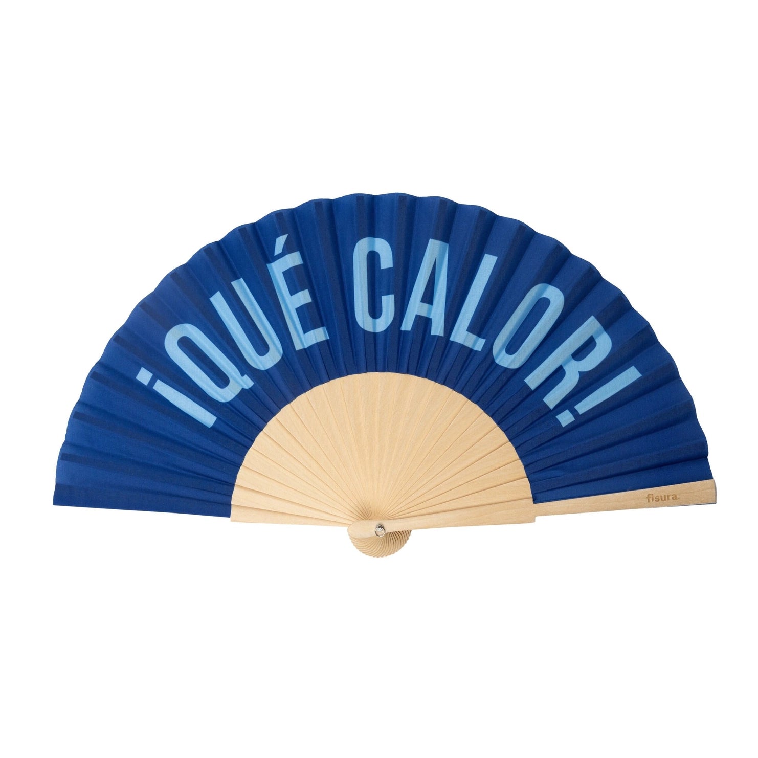 Two-tone blue fabric fan with wooden frame for lightweight, extra-portable relief from the summer heat! This modern, funny and fun handheld fan reads, "¡Qué Calor!" meaning "It's so hot!" in Spanish.